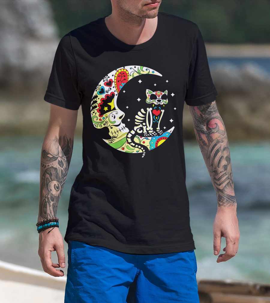 Dia De Los Muertos Halloween Sugar Skull Cat On Crescent Moon T-Shirt