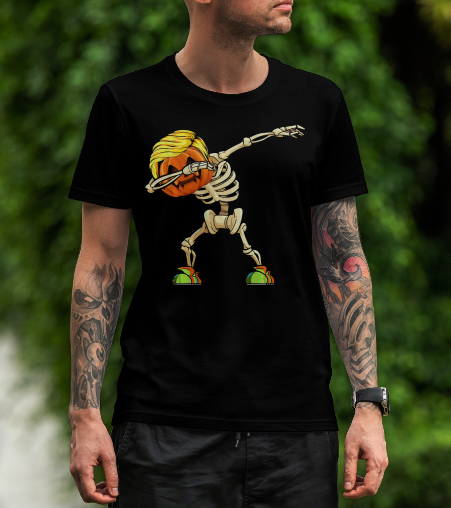 Funny Halloween Dabbing Skeleton Pumpkin With Golden Hair And Colorful Sneakers T-Shirt