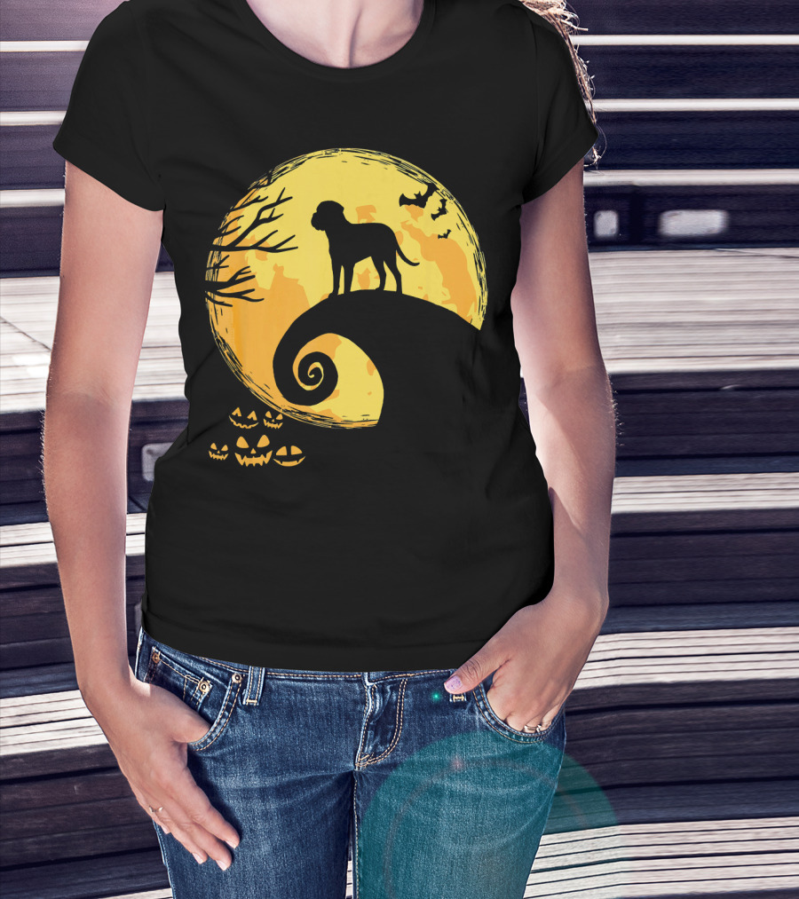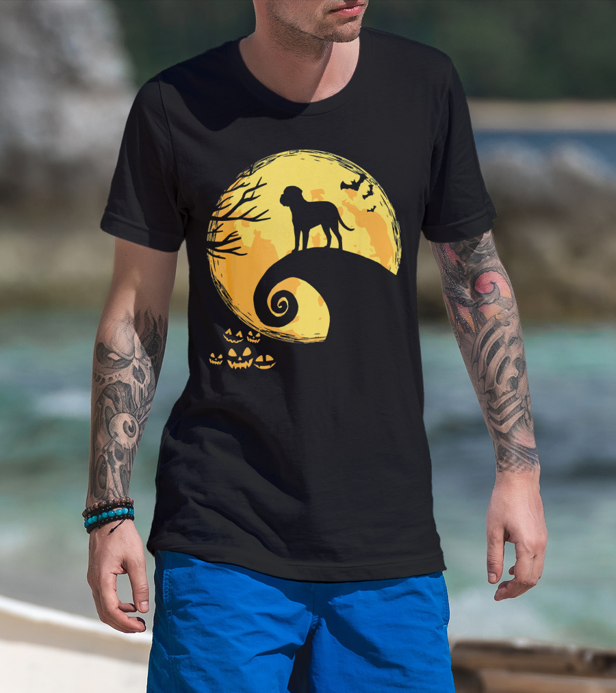 Bullmastiff Silhouette Moonlit Halloween Scene With Pumpkins And Bats T-Shirt