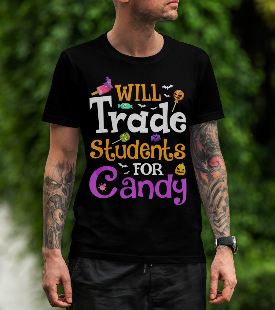 Will Trade Students For Candy Halloween Teacher Shirt With Cute Sweets And Bats T-Shirt
