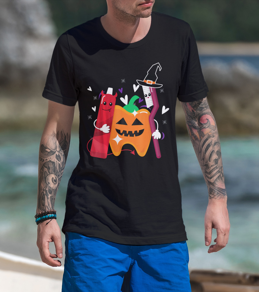 Happy Halloween Costume Toothbrush Tooth With Pumpkin And Toothpaste Characters T-Shirt
