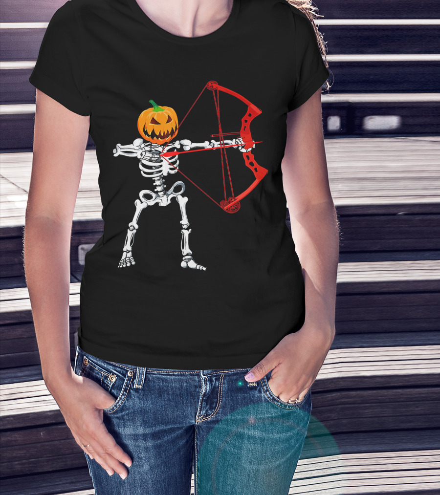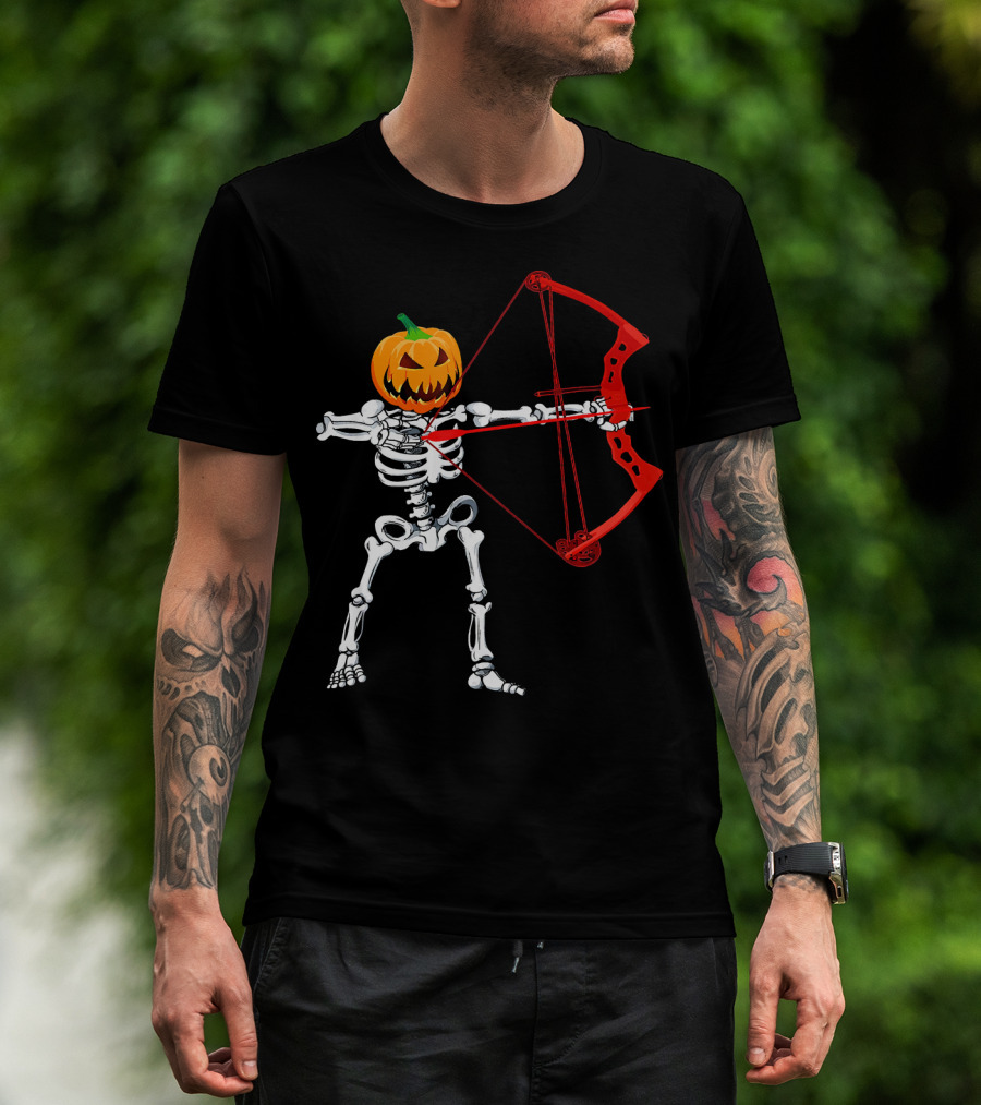 Skeleton Pumpkin Head With Red Bow Archery Halloween T-Shirt