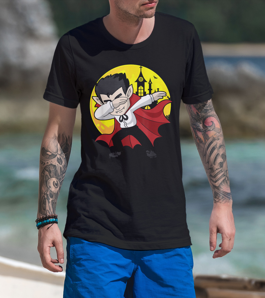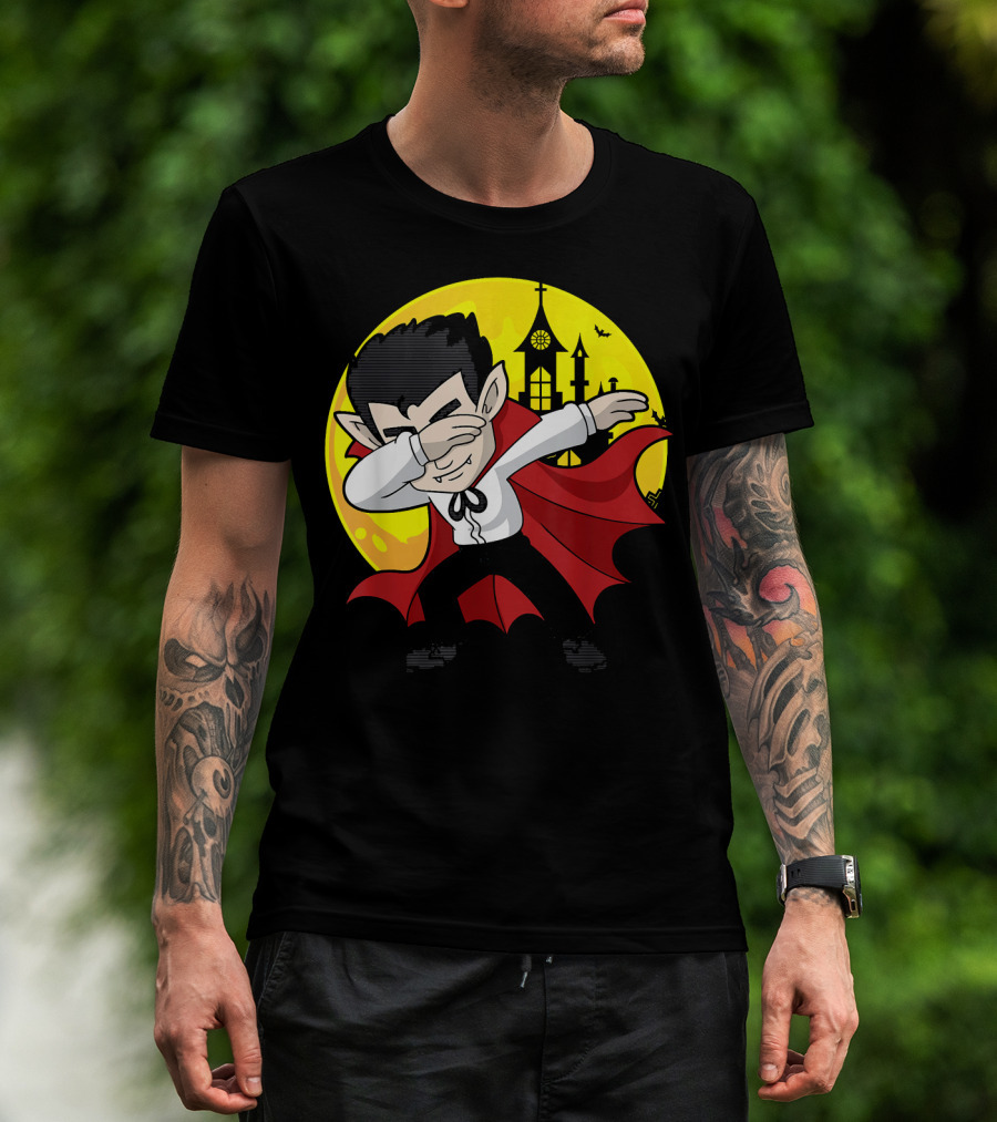 The Vampire Dabbing Halloween Costume Dab Moon Castle T-shirt is designed for everyday wear and a consistent fit. Fabric is pre-shrunk ring-spun cotton with durable stitching. See the size chart below for exact measurements.