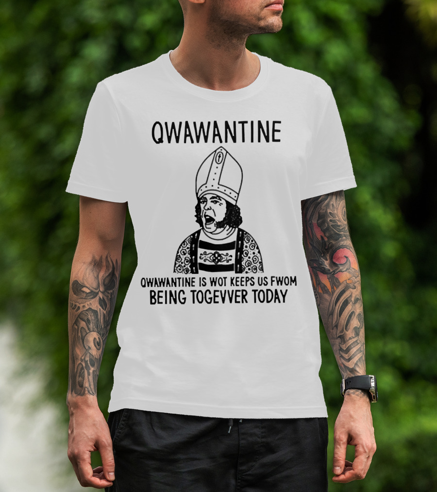 The Qwawantine is Wot Keeps Us Fwom Being Togevver Today T-shirt is designed for everyday wear and a consistent fit. Fabric is pre-shrunk ring-spun cotton with durable stitching. See the size chart below for exact measurements.
