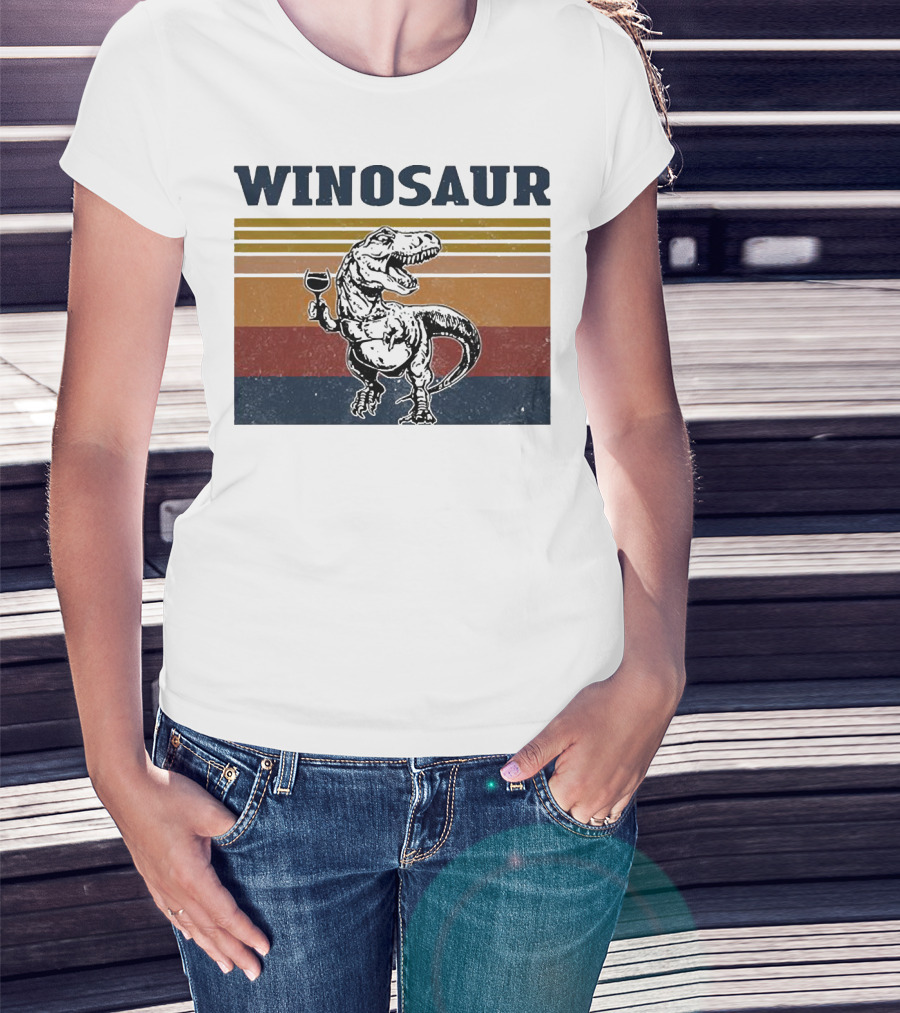 WINOSAUR T-Rex Drinking Wine Retro Stripes T-Shirt