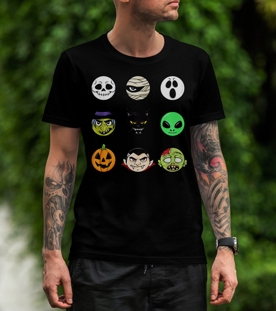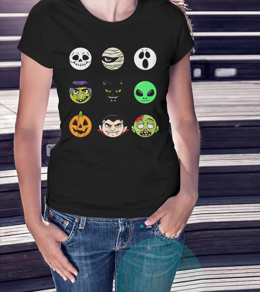 Scary Faces Halloween Emoji Emoji Icons Vampire Mummy Alien Ghost Pumpkin Monster Cat Witch T-Shirt