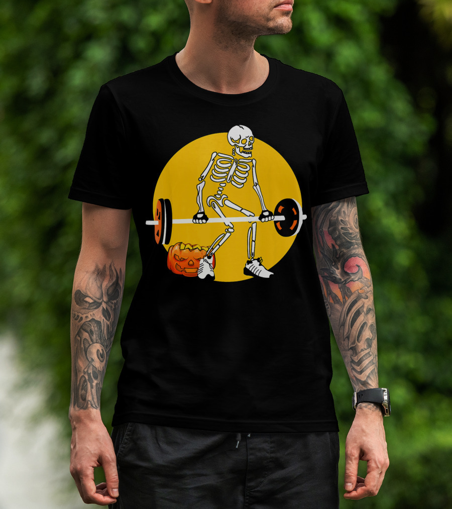Skeleton Weightlifting With Pumpkin In Yellow Circle T-Shirt