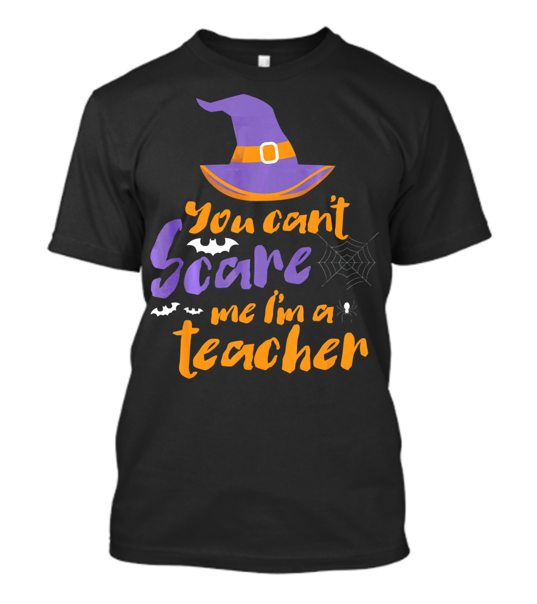 The You Can't Scare Me I'm a Teacher Witch Hat Bats Spider Web Halloween T-shirt is designed for everyday wear and a consistent fit. Fabric is pre-shrunk ring-spun cotton with durable stitching. See the size chart below for exact measurements.