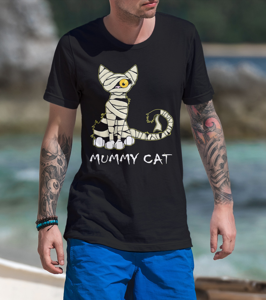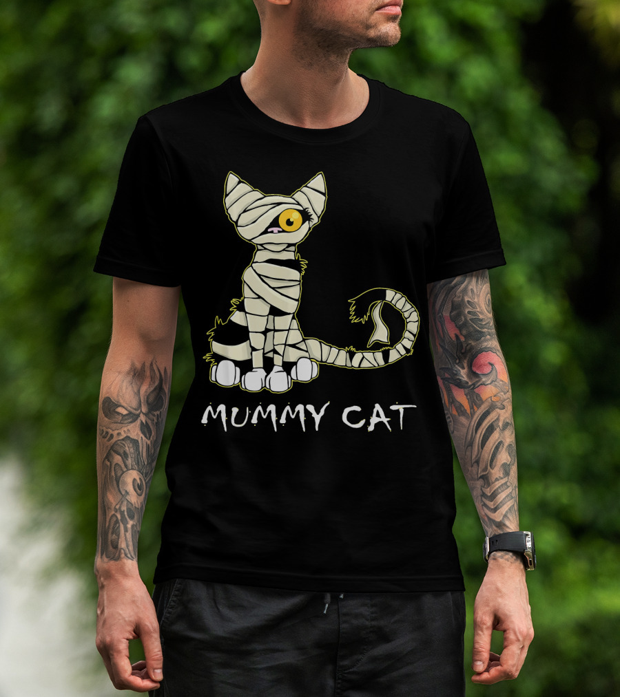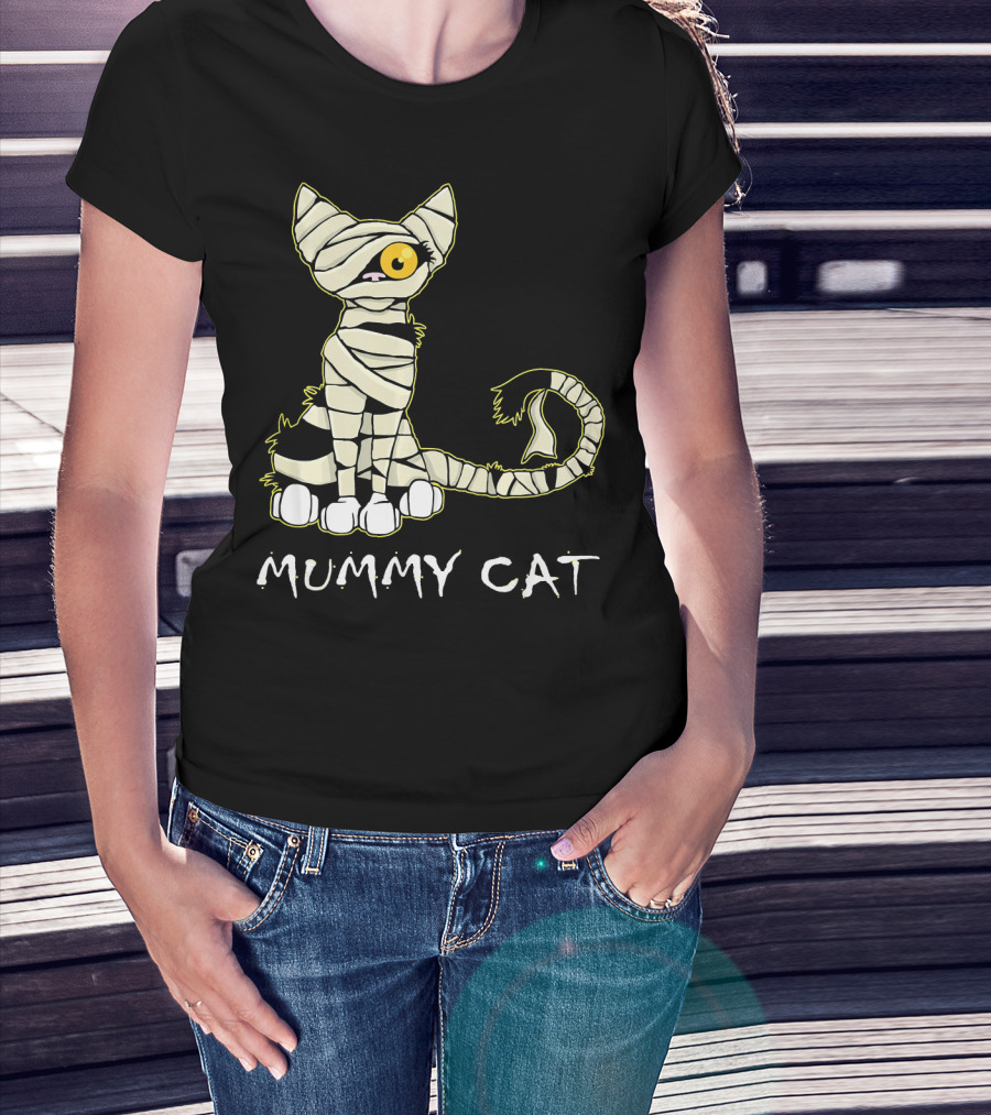 The Mummy Cat Black Cat Mummy T-shirt is designed for everyday wear and a consistent fit. Fabric is pre-shrunk ring-spun cotton with durable stitching. See the size chart below for exact measurements.