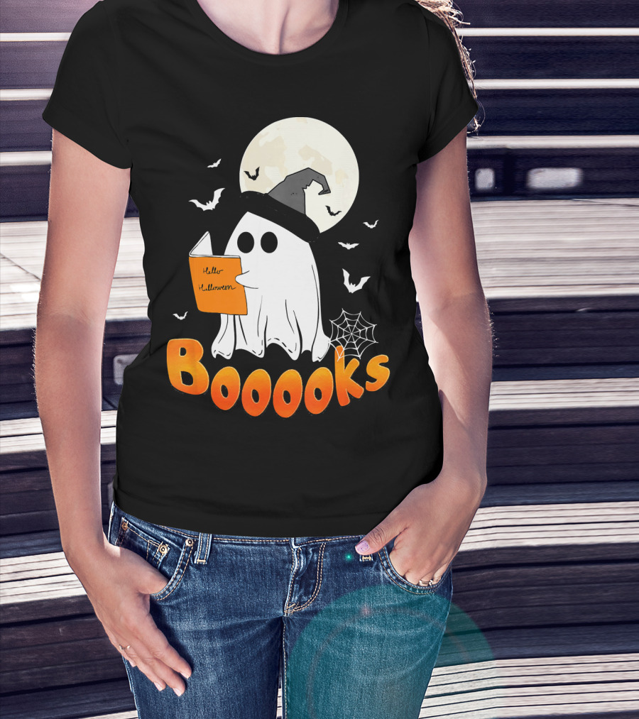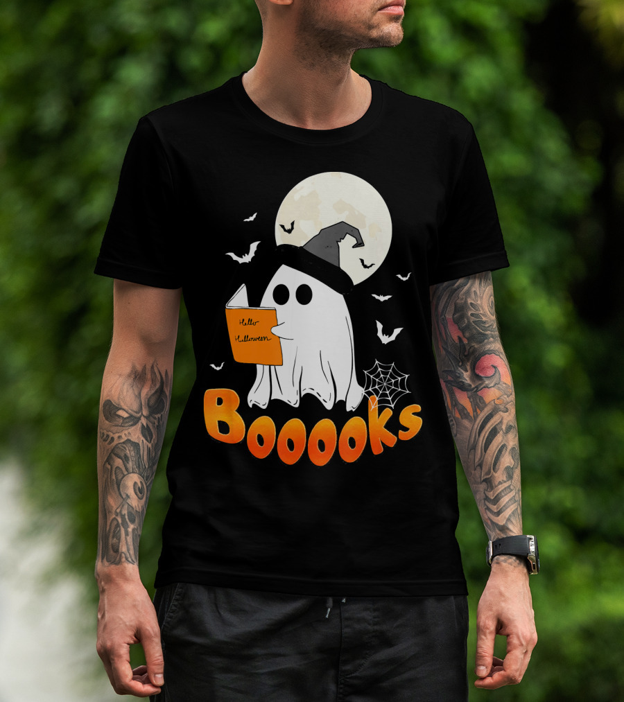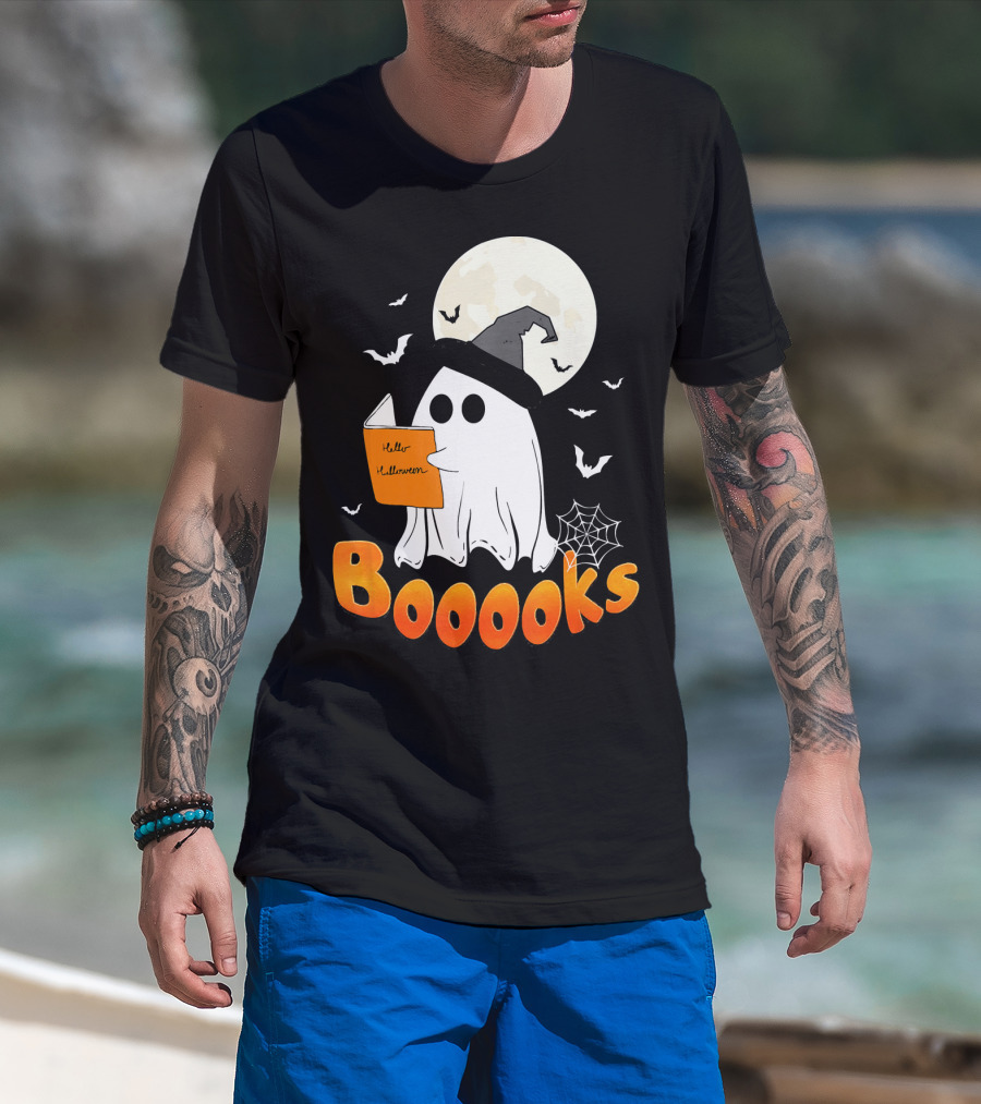 The Boooks Ghost Reading Halloween Bats Moon Hat T-shirt is designed for everyday wear and a consistent fit. Fabric is pre-shrunk ring-spun cotton with durable stitching. See the size chart below for exact measurements.
