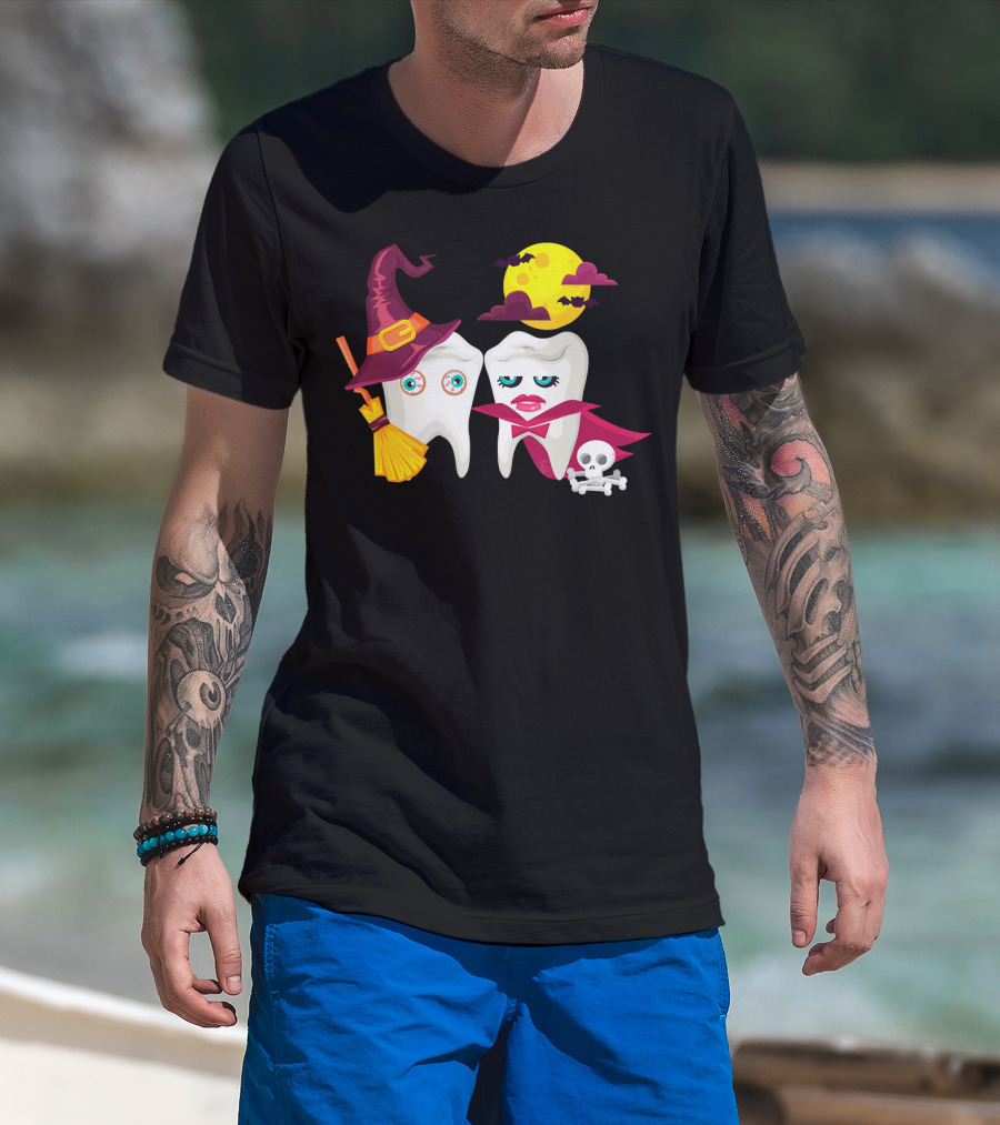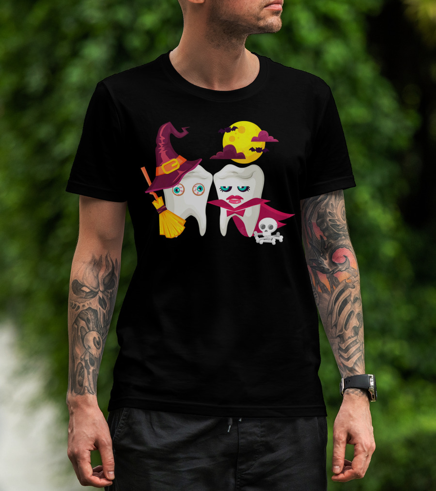 The Witch Hat Broom Vampire Teeth Halloween Moon Bats T-shirt is designed for everyday wear and a consistent fit. Fabric is pre-shrunk ring-spun cotton with durable stitching. See the size chart below for exact measurements.