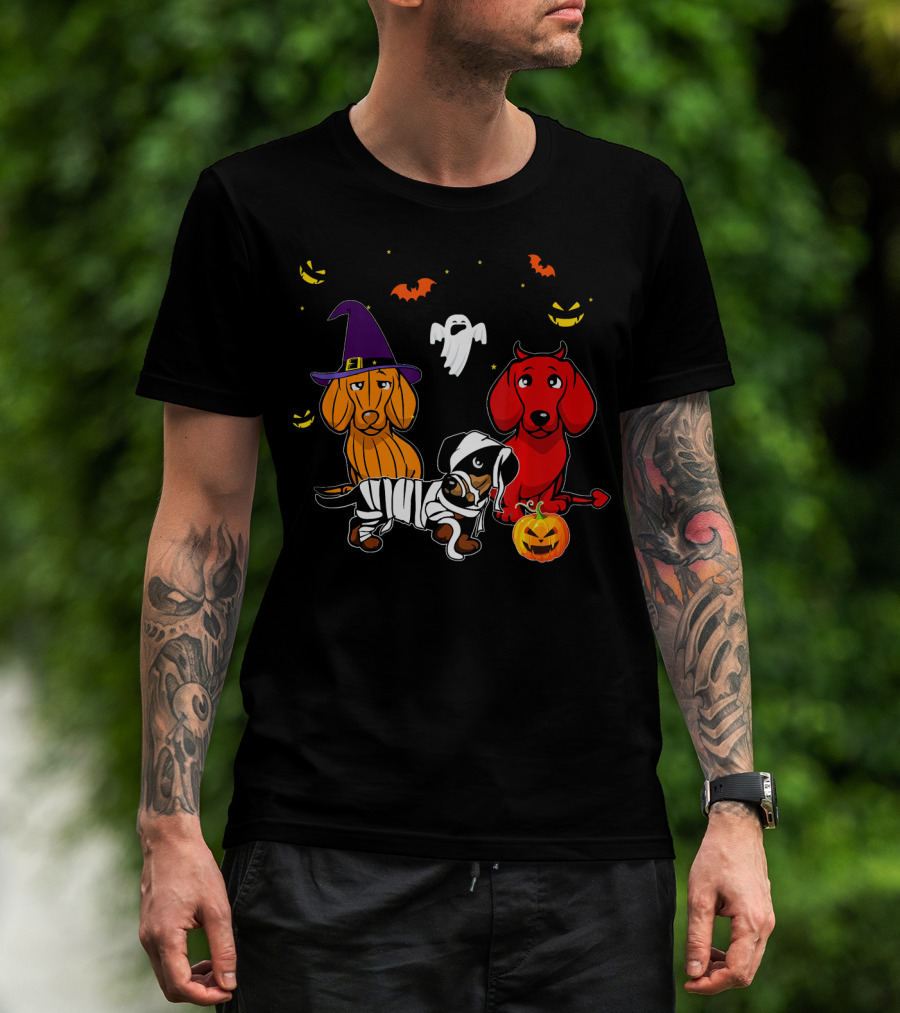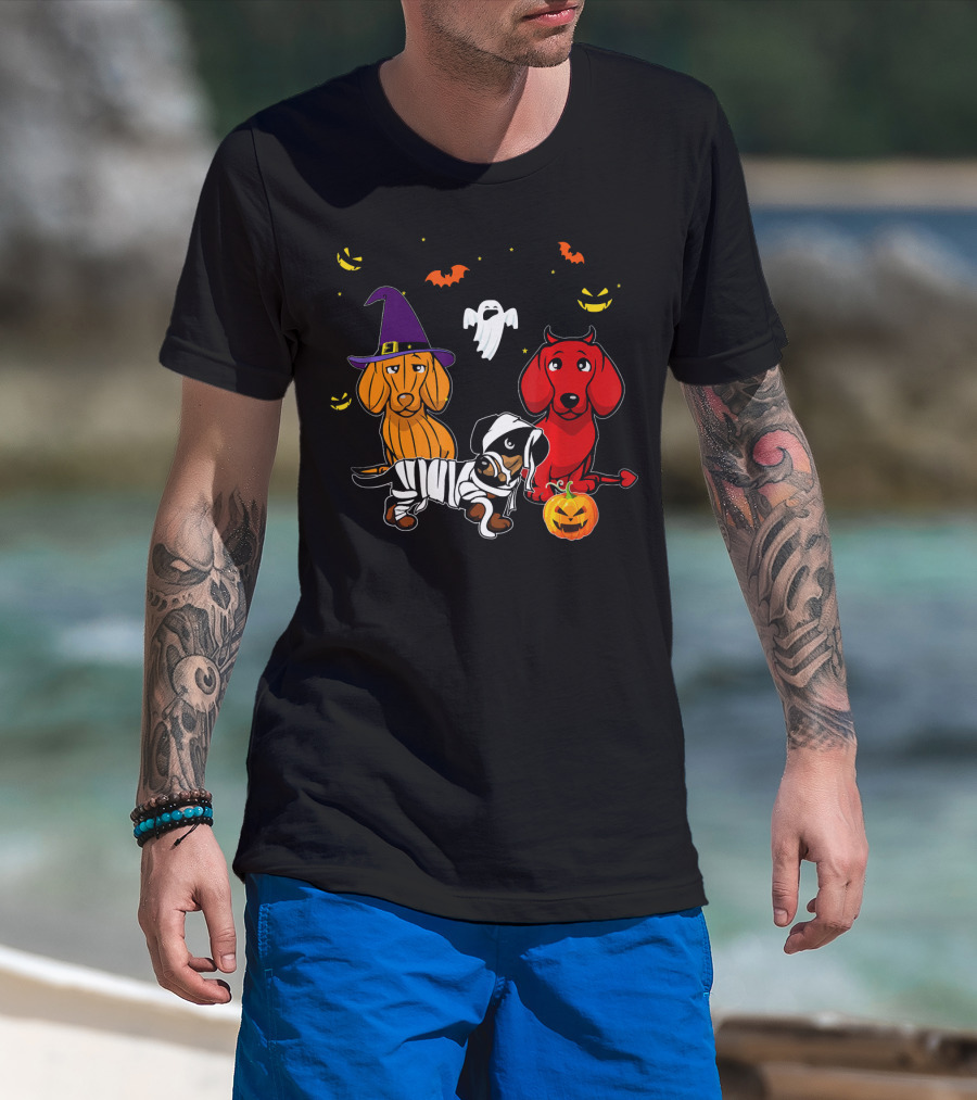 Dachshund In Witch, Devil, And Mummy Costumes With Pumpkin And Ghost T-Shirt