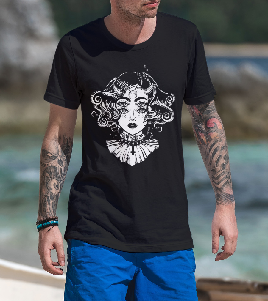 Horned Devil Girl Satanic Occult Triple-Eyed Cross T-Shirt