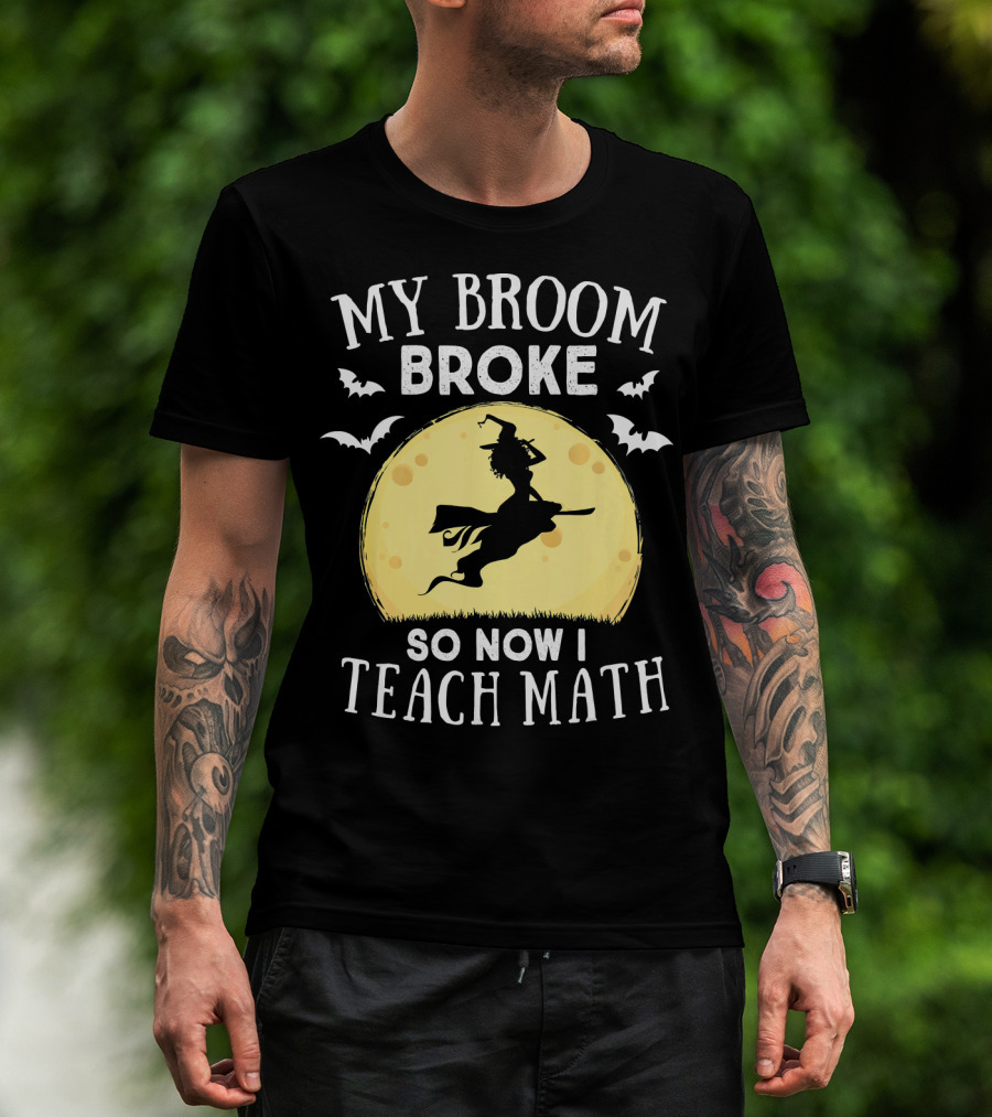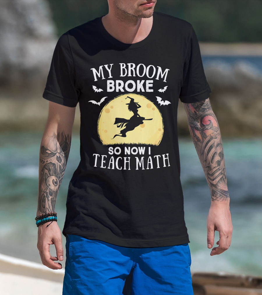 My Broom Broke So Now I Teach Math Halloween Witch Flying Bats Moon T-Shirt