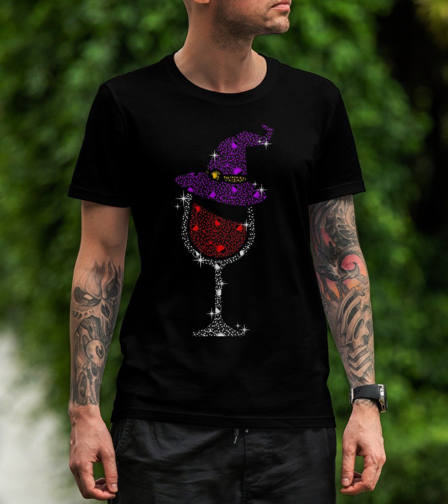 Sparkling Purple Witch Hat Red Wine Glass Halloween T-Shirt