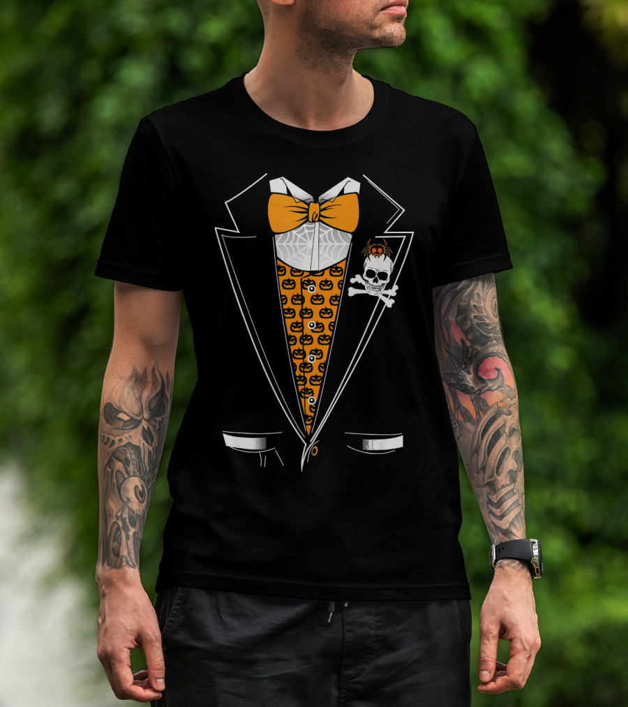 Halloween Tuxedo 3D Style Skull Pumpkin Spider Bowtie T-Shirt