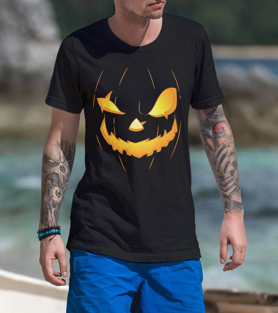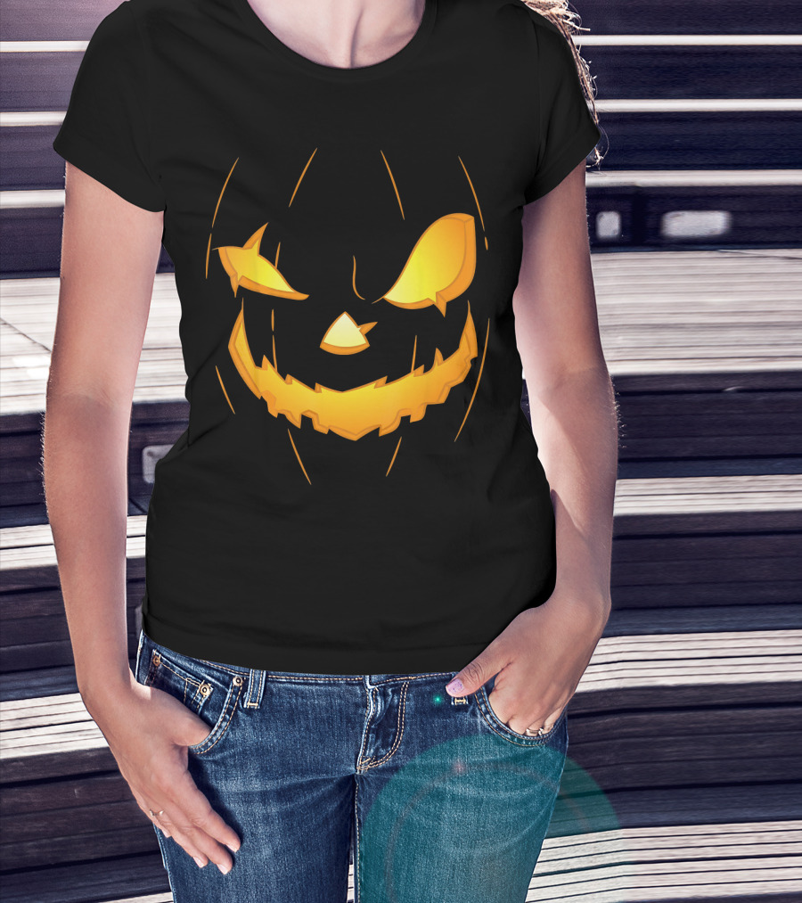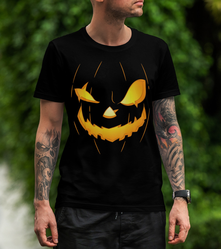 The Halloween Pumpkin Jack O Lantern Face Glowing Scary Expression T-shirt is designed for everyday wear and a consistent fit. Fabric is pre-shrunk ring-spun cotton with durable stitching. See the size chart below for exact measurements.