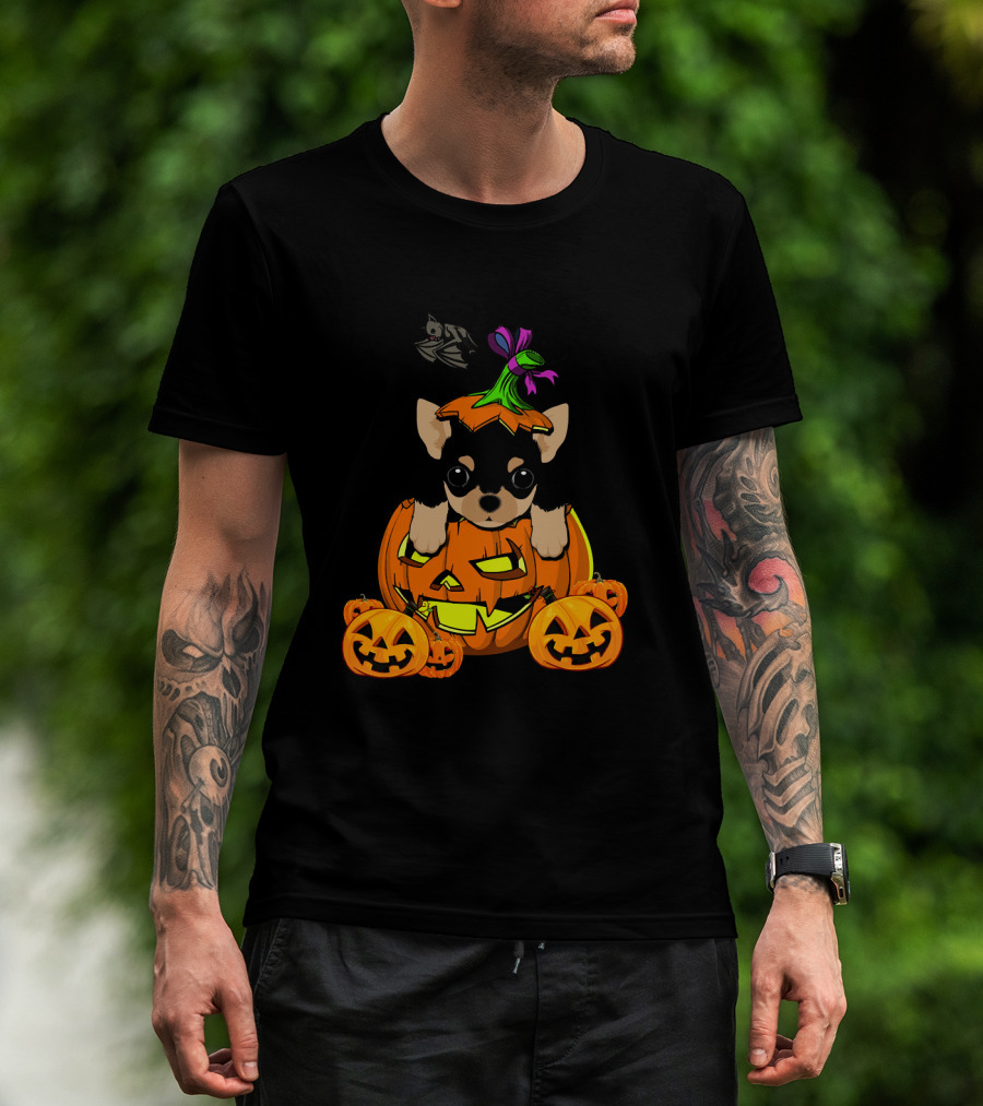 The Happy Halloween Funny Chihuahua Jack-O'-Lantern Pumpkin with Bats T-shirt is designed for everyday wear and a consistent fit. Fabric is pre-shrunk ring-spun cotton with durable stitching. See the size chart below for exact measurements.