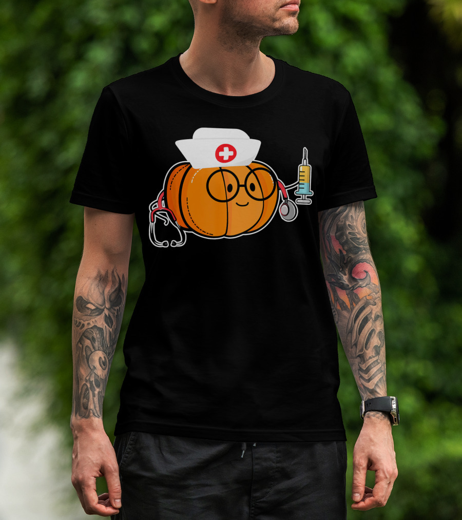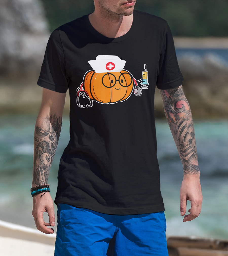 Nurse Halloween Pumpkin With Stethoscope And Syringe Smiling Face T-Shirt