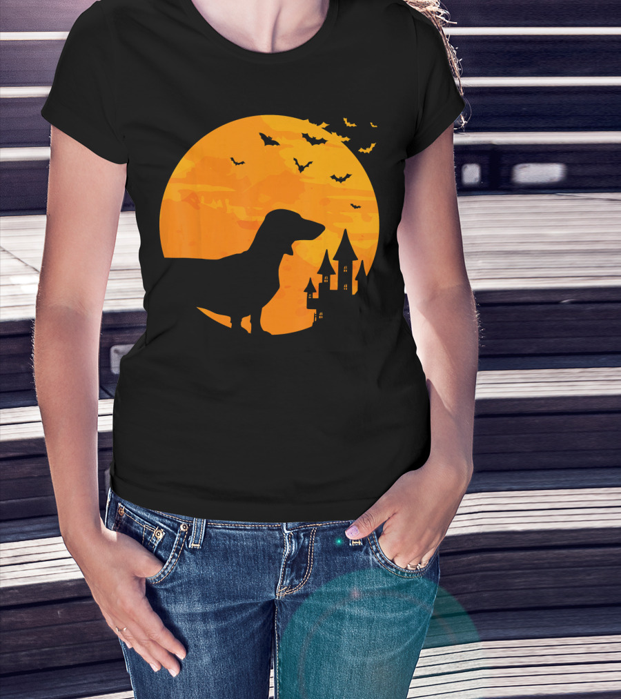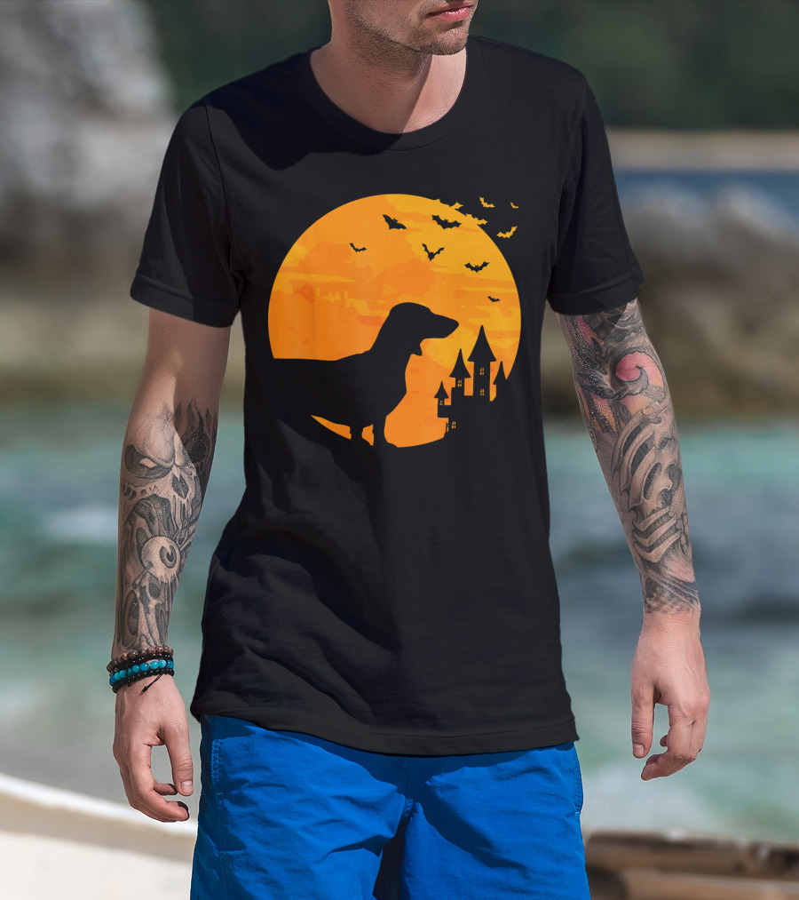 Dachshund Halloween Silhouette With Bats And Haunted Castle T-Shirt