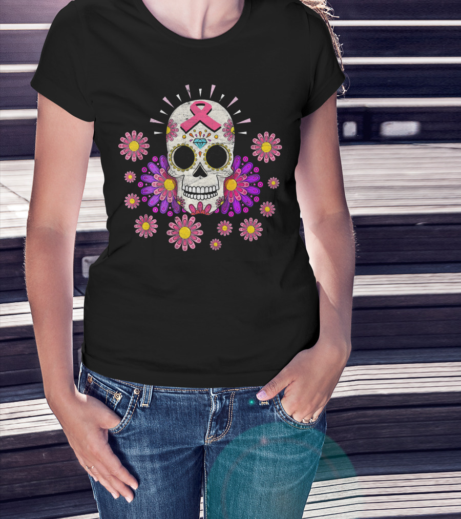Breast Cancer Awareness Sugar Skull Pink Ribbon Floral Accents T-Shirt