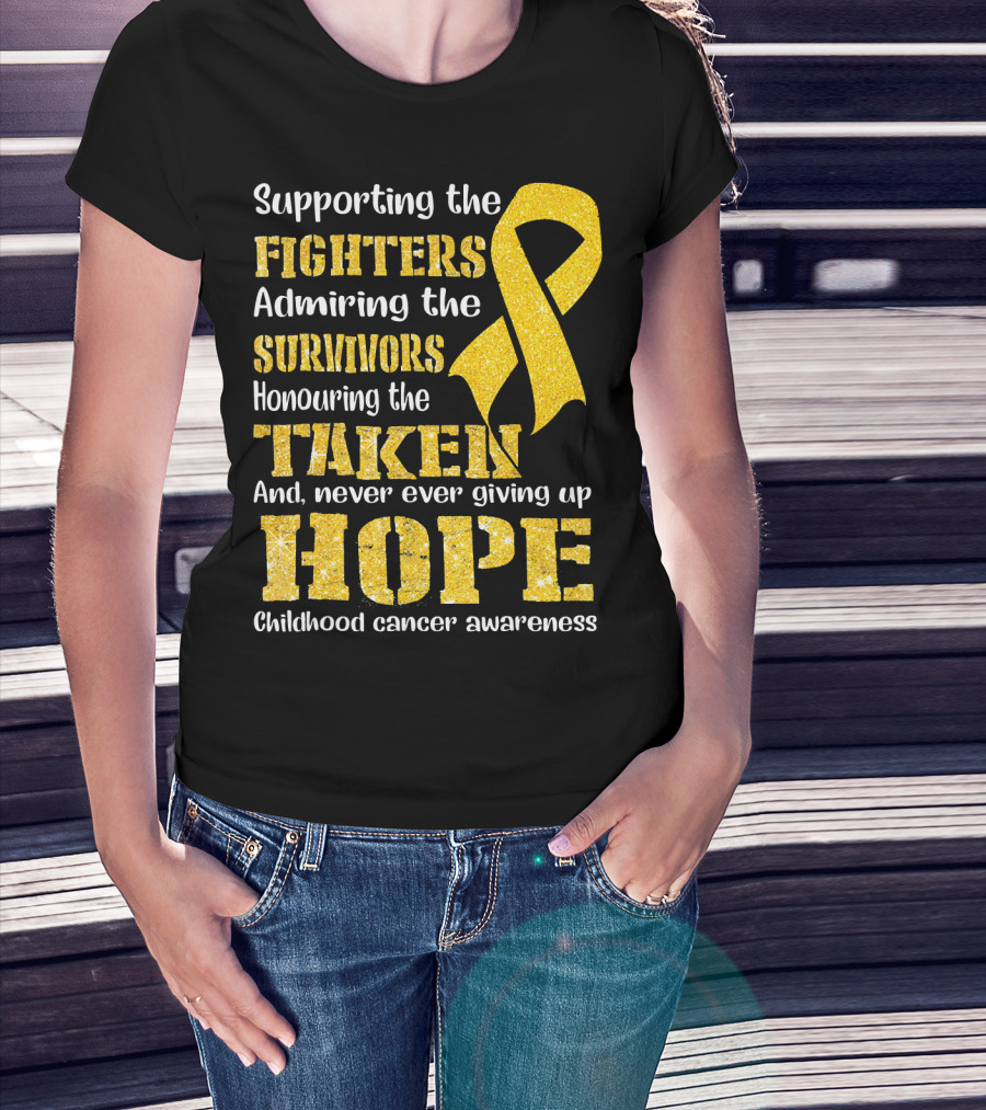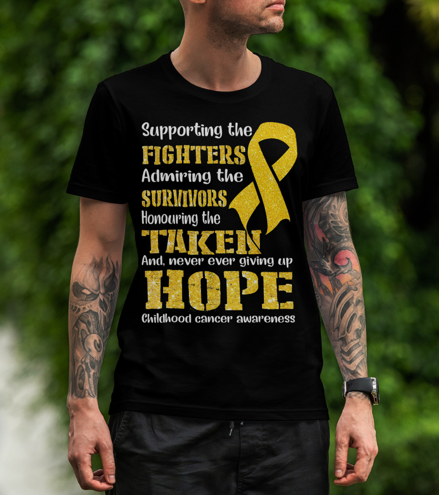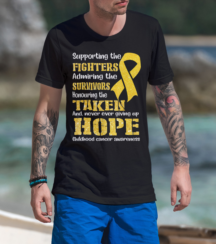 Supporting The Fighters Admiring The Survivors Honouring The Taken And Never Ever Giving Up Hope Childhood Cancer Awareness T-Shirt