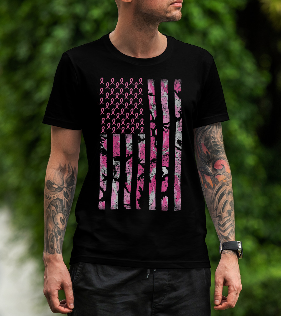 Breast Cancer Awareness Survivor Pink Ribbon American Flag Camo T-Shirt