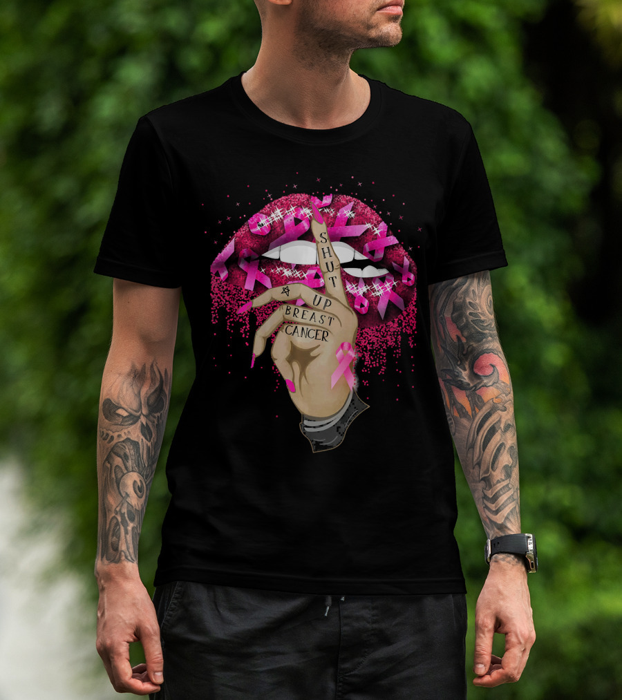 Shut Up Breast Cancer Pink Lips And Finger Tattoo With Ribbons T-Shirt