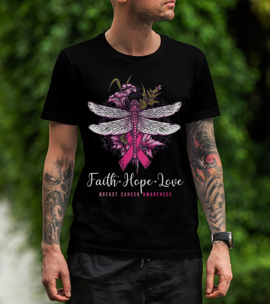 Faith Hope Love Breast Cancer Awareness Dragonfly Pink Ribbon Floral Motif T-Shirt