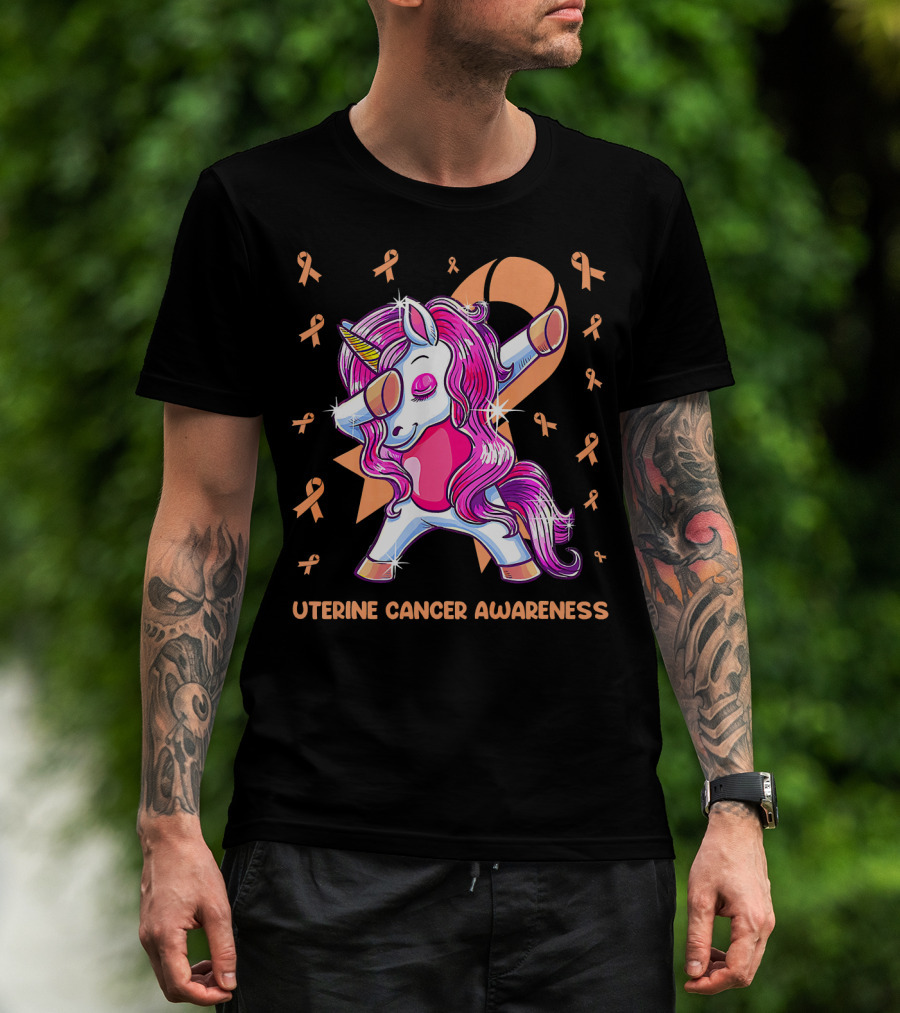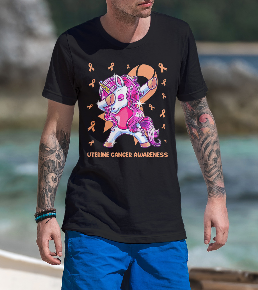 Dabbing Unicorn With Pink Ribbon For Uterine Cancer Awareness T-Shirt