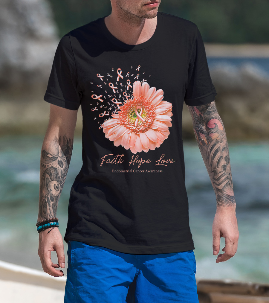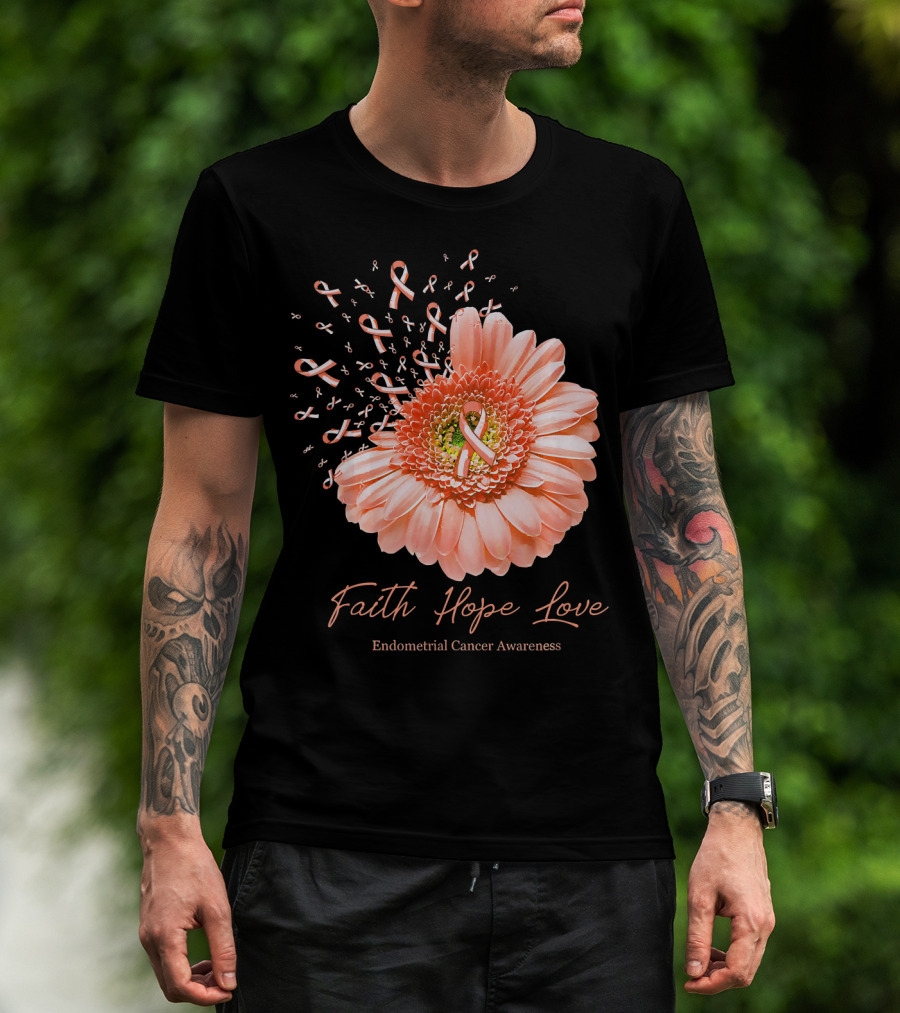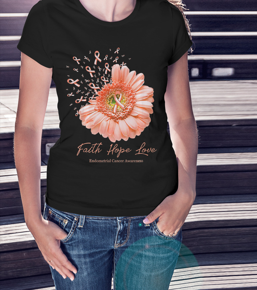 Faith Hope Love Endometrial Cancer Awareness Pink Ribbon Flower T-Shirt