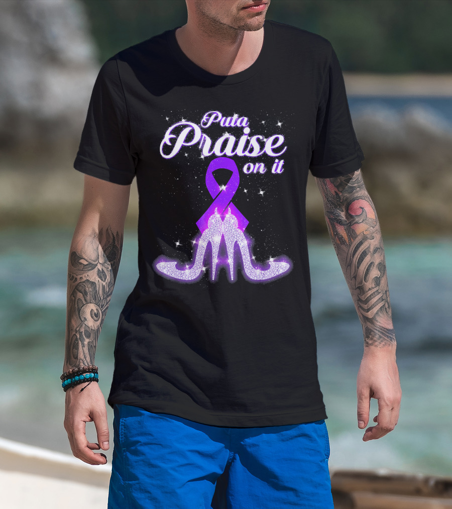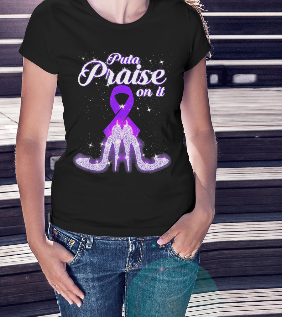The Puta Praise On It Purple Ribbon Heels Sparkle T-shirt is designed for everyday wear and a consistent fit. Fabric is pre-shrunk ring-spun cotton with durable stitching. See the size chart below for exact measurements.