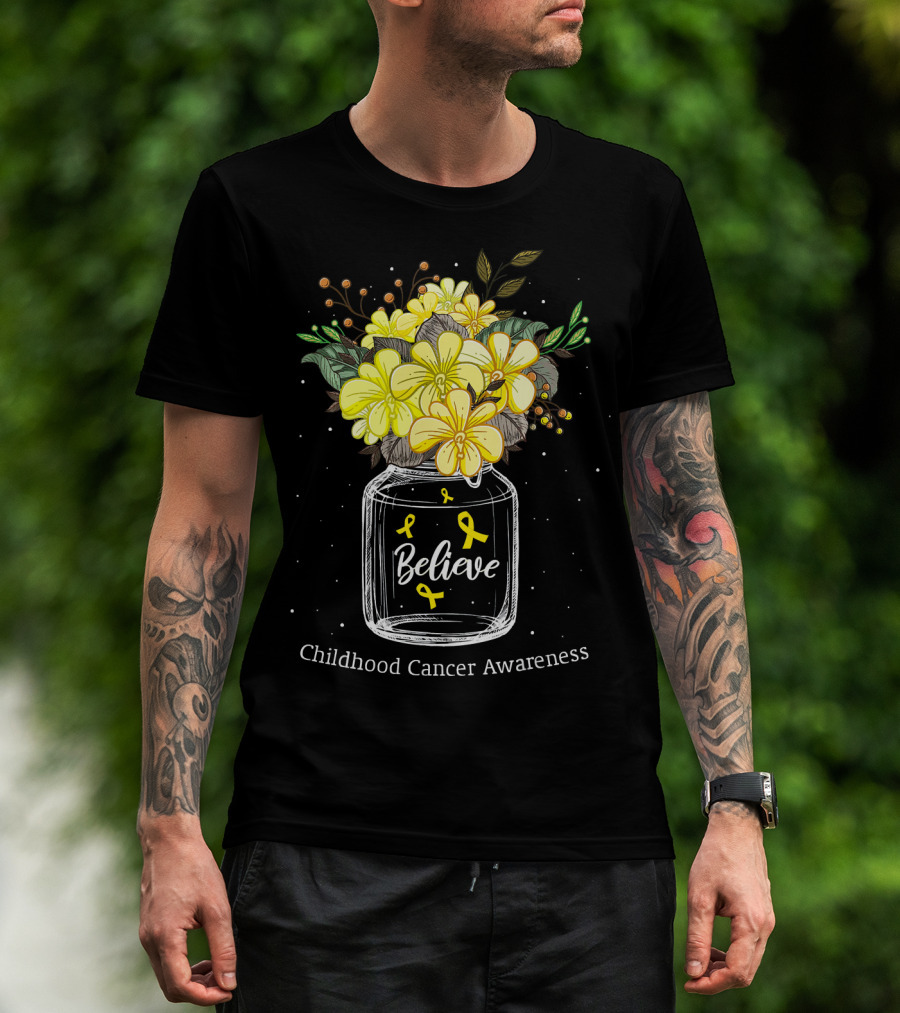 Believe Yellow Ribbon Childhood Cancer Awareness Flower Bouquet T-Shirt