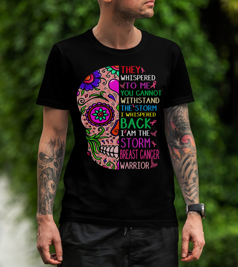 The THEY WHISPERED TO ME YOU CANNOT WITHSTAND THE STORM I WHISPERED BACK I AM THE STORM BREAST CANCER WARRIOR T-shirt is designed for everyday wear and a consistent fit. Fabric is pre-shrunk ring-spun cotton with durable stitching. See the size chart below for exact measurements.