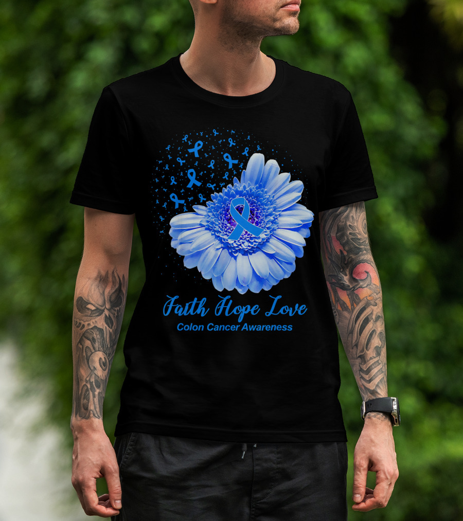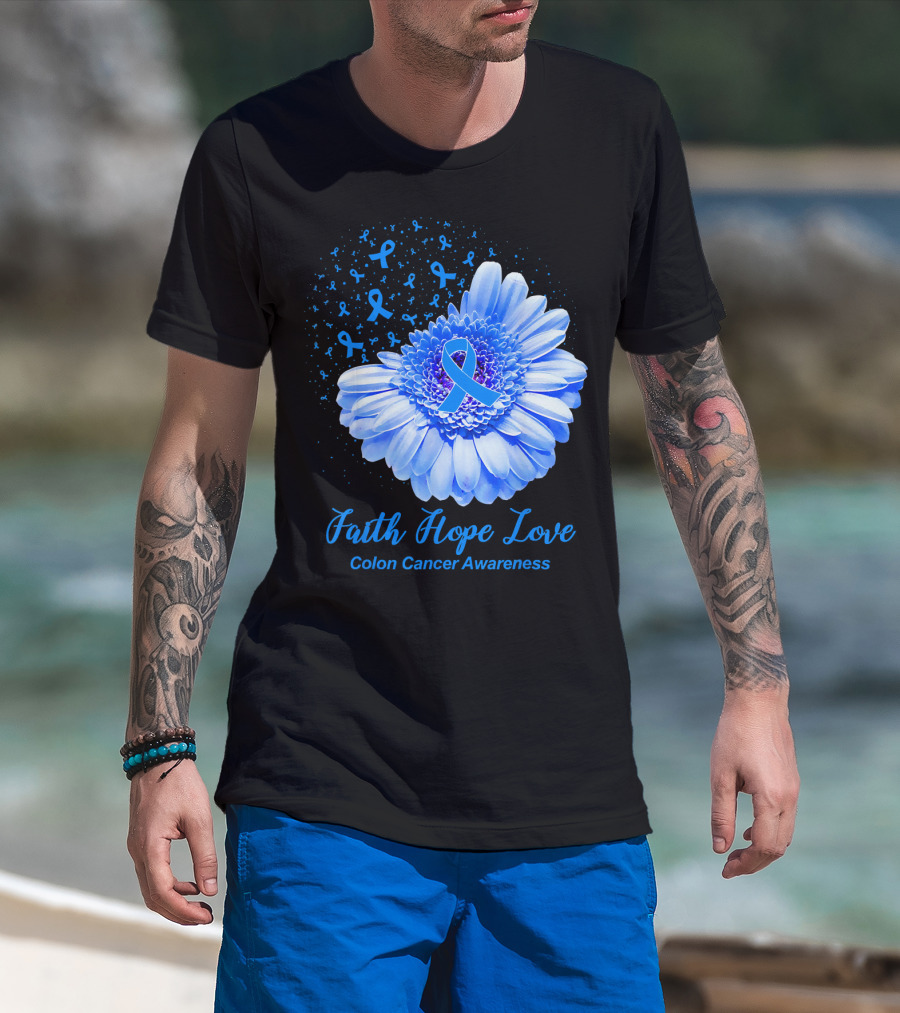Faith Hope Love Colon Cancer Awareness Blue Ribbon Flower T-Shirt