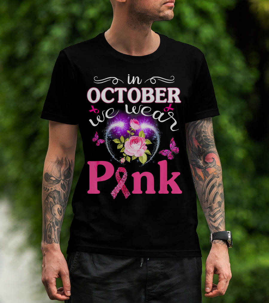 The In October We Wear Pink Breast Cancer Awareness Mom Wife Women T-shirt is designed for everyday wear and a consistent fit. Fabric is pre-shrunk ring-spun cotton with durable stitching. See the size chart below for exact measurements.