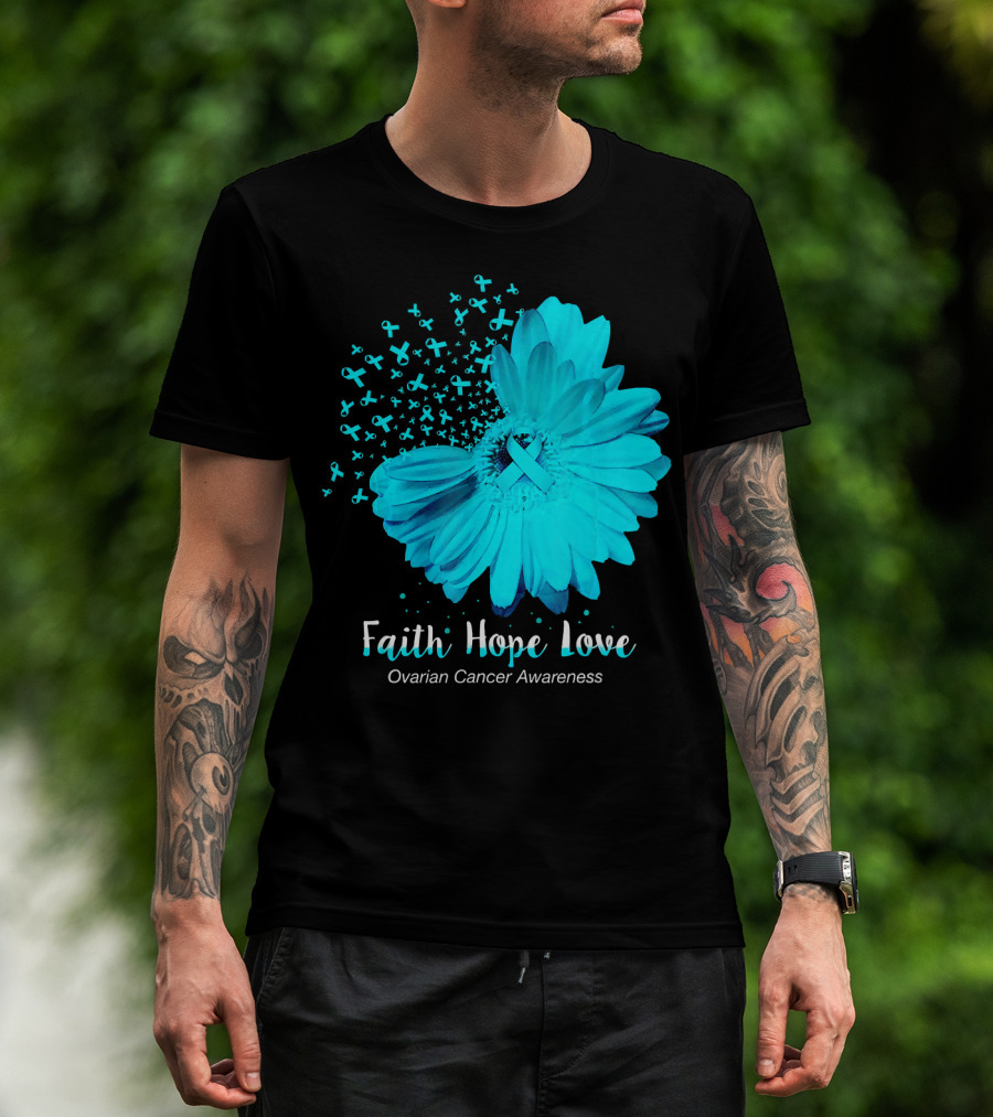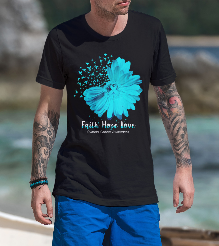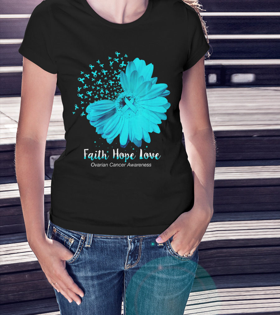 Faith Hope Love Turquoise Ribbon Flower Ovarian Cancer Awareness T-Shirt