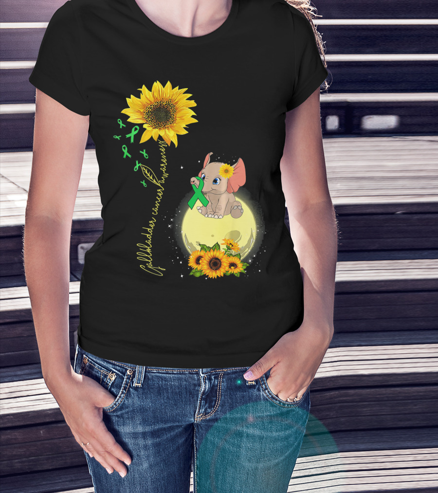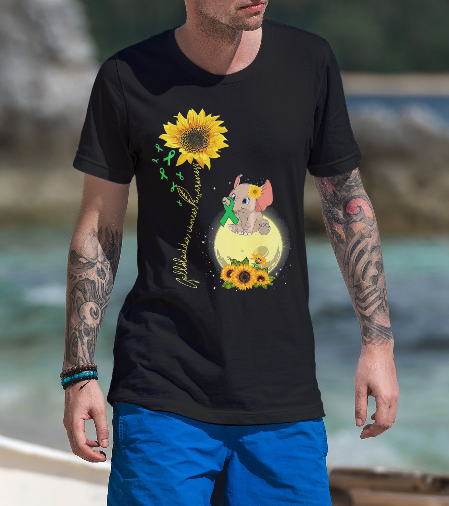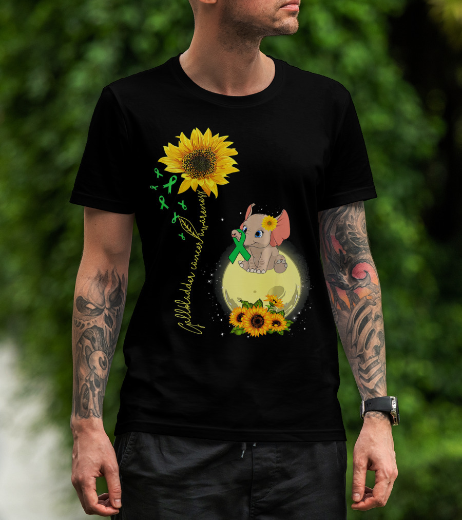 Gallbladder Cancer Awareness Elephant With Sunflowers And Green T-Shirt