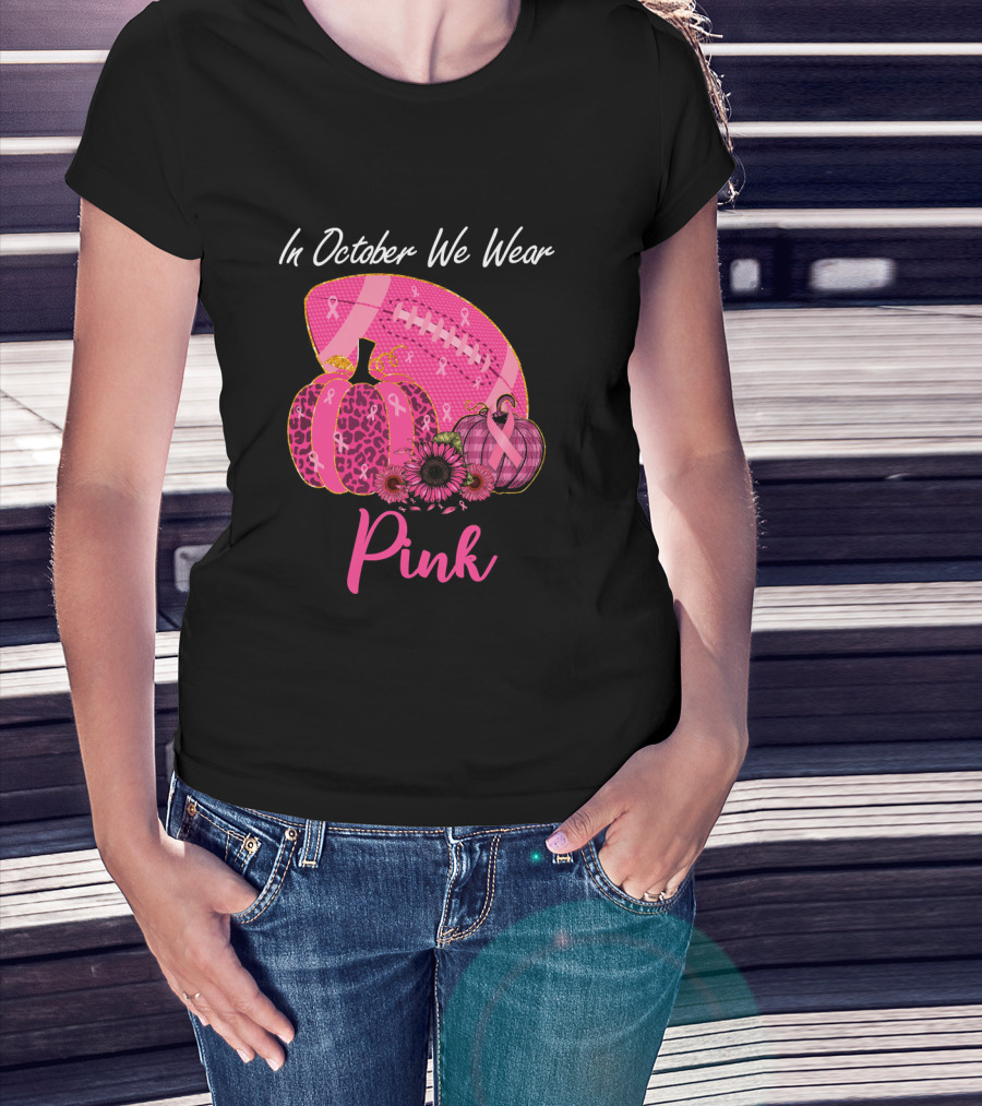 In October We Wear Pink Pumpkin And Football Breast Cancer Awareness T-Shirt