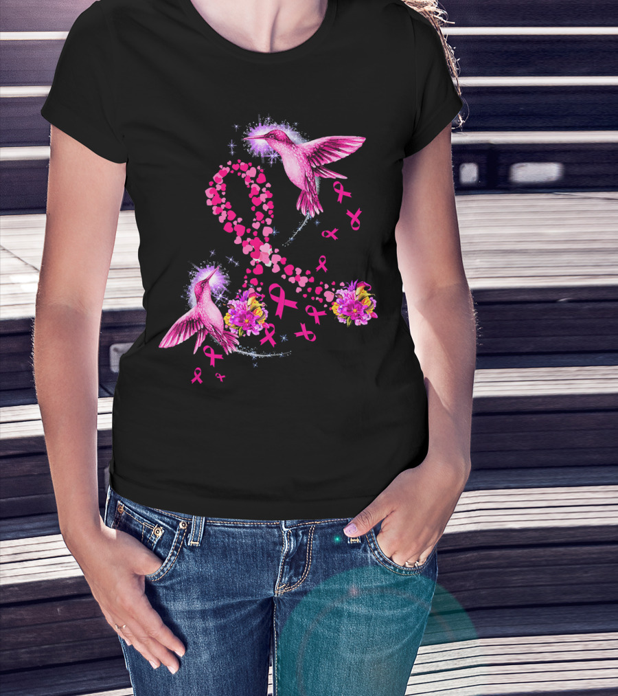 Hummingbird Heart Pink Ribbon Breast Cancer Awareness Flowers T-Shirt