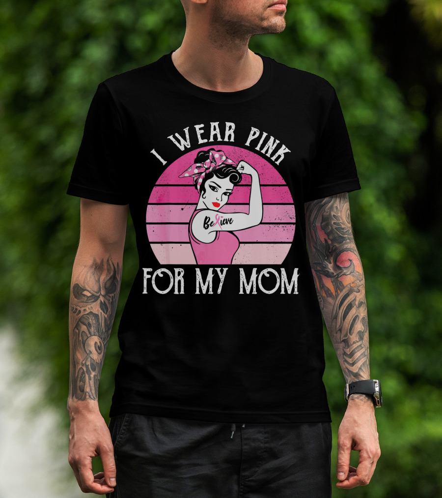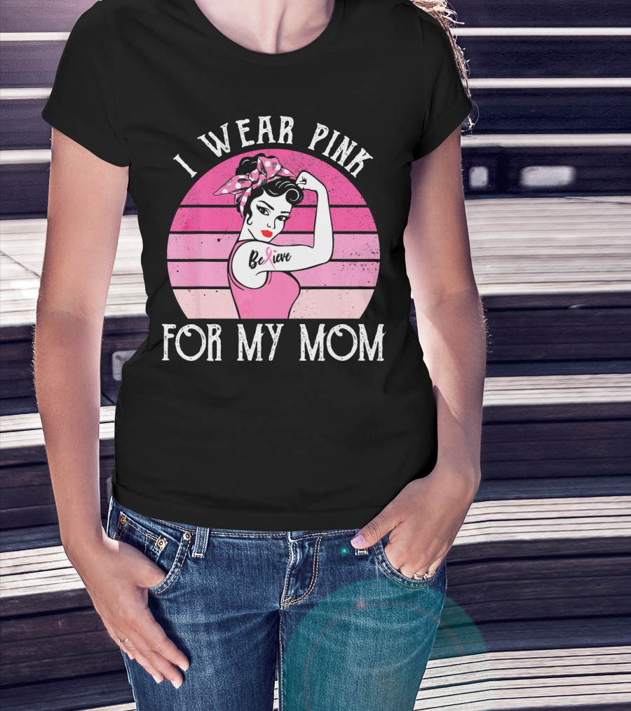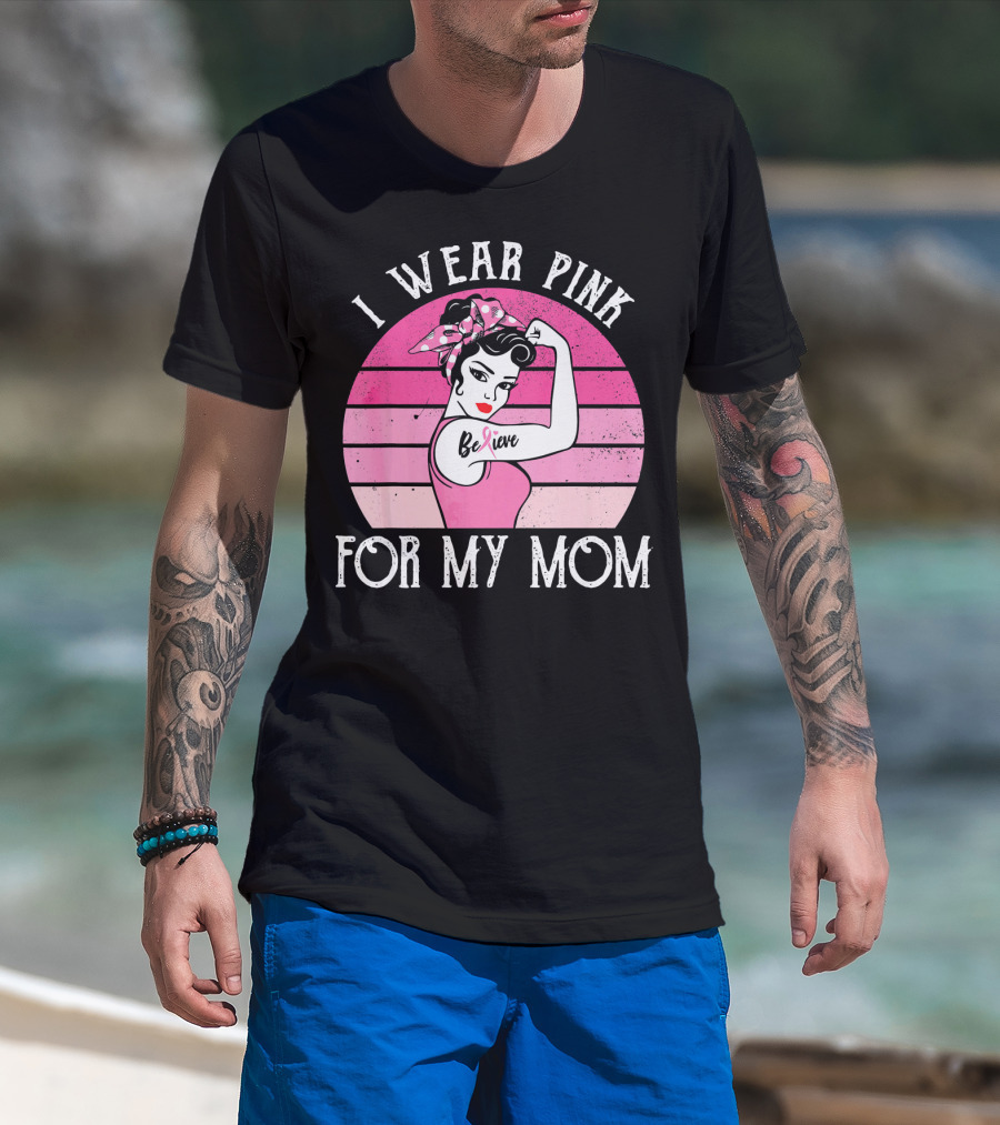 Retro Sunset I Wear Pink For My Mom Believe Breast Cancer Support T-Shirt