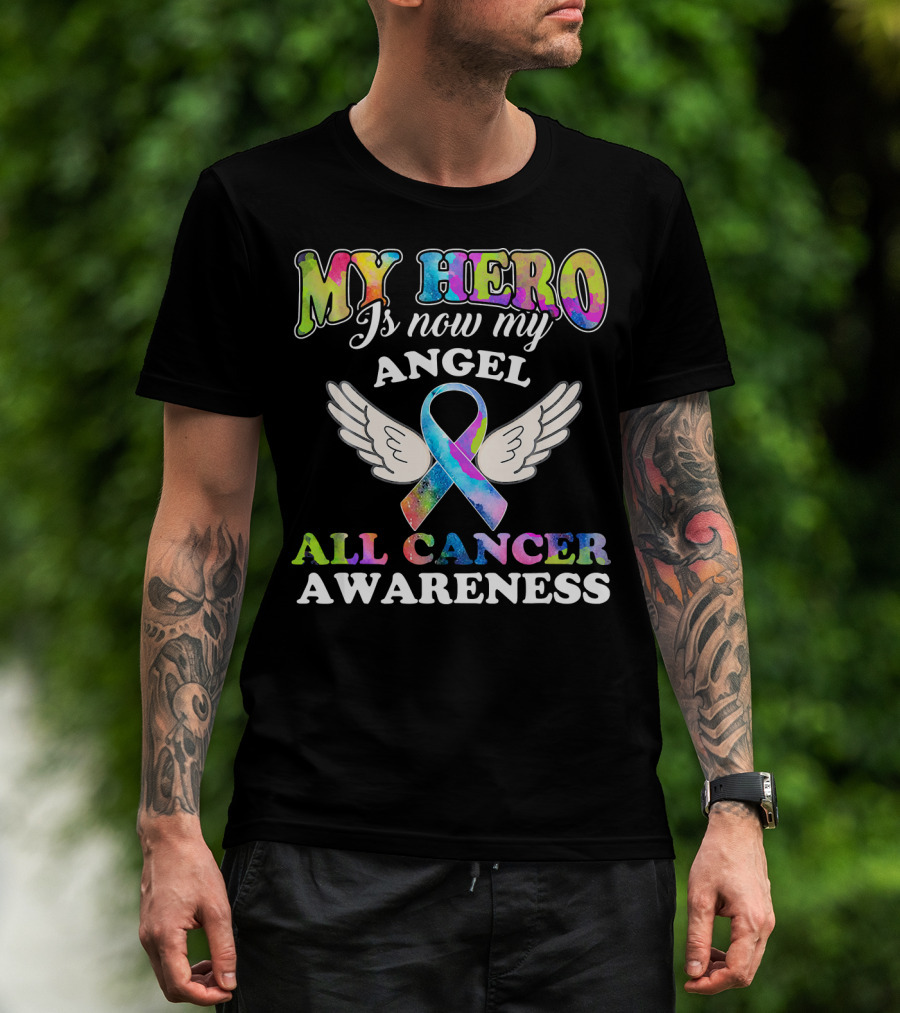 My Hero Is Now My Angel All Cancer Awareness Ribbon With Wings T-Shirt