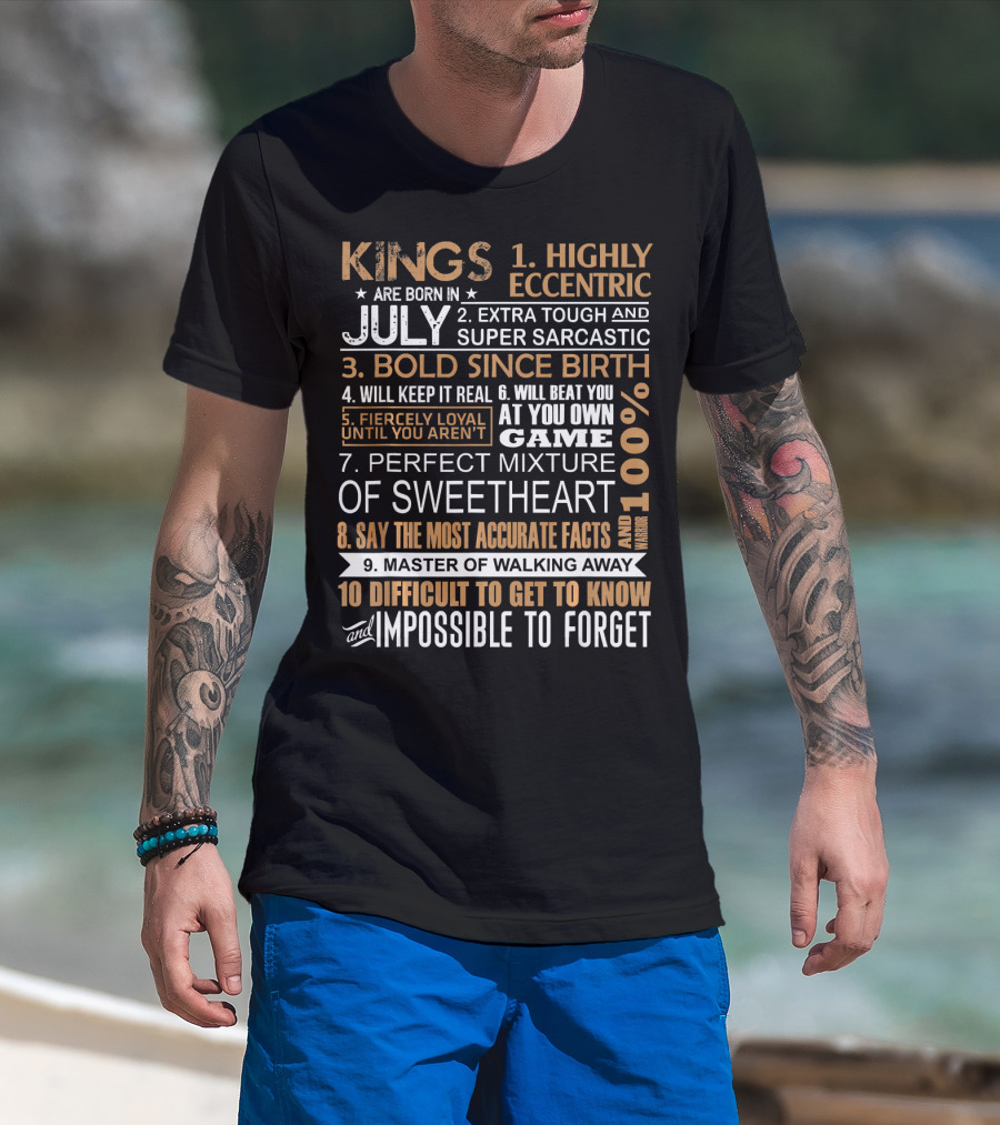 The Kings Are Born In July Highly Eccentric Extra Tough Bold Since Birth Fiercely Loyal Impossible to Forget T-shirt is designed for everyday wear and a consistent fit. Fabric is pre-shrunk ring-spun cotton with durable stitching. See the size chart below for exact measurements.