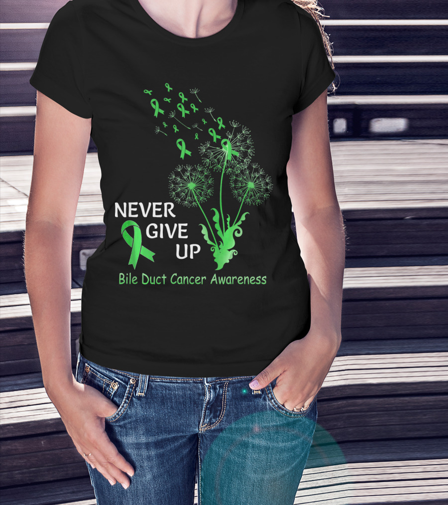 Never Give Up Bile Duct Cancer Awareness Dandelion Green Ribbons T-Shirt
