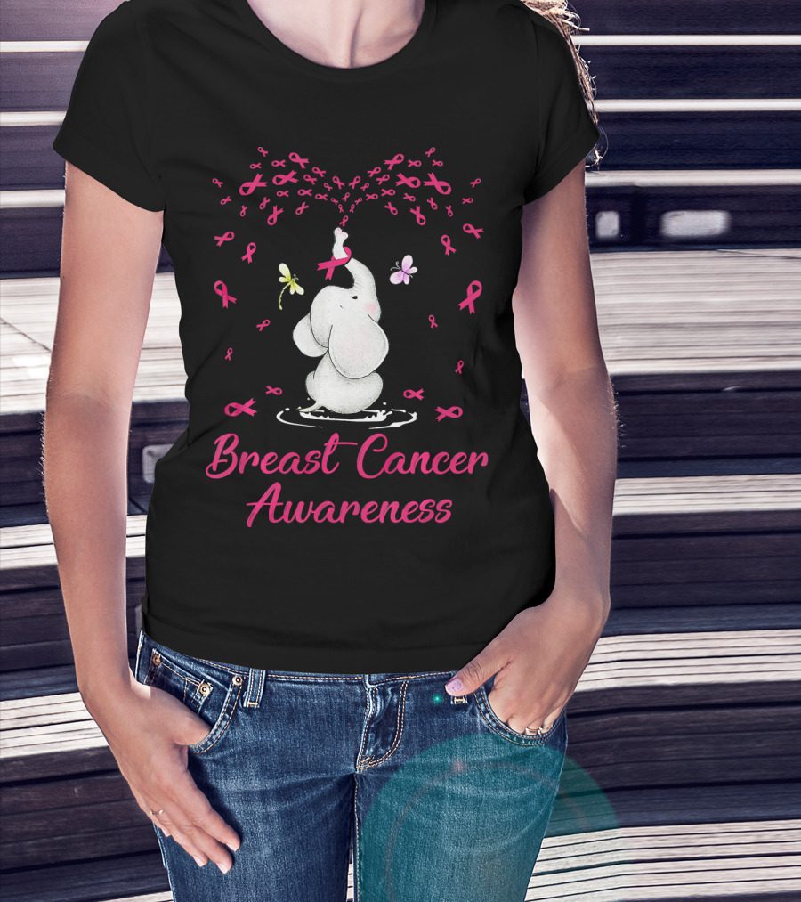 Elephant With Ribbon Breast Cancer Awareness With Butterflies And Ribbons T-Shirt
