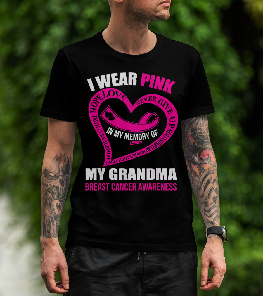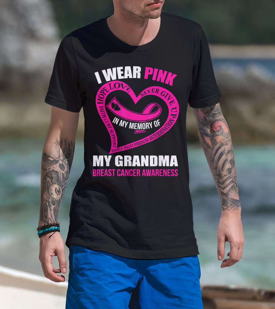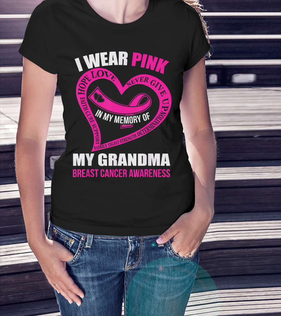 I Wear Pink In My Memory Of My Grandma Breast Cancer Awareness Hope Love Faith Cure Support Family Fight Strength Determination Never Give Up T-Shirt