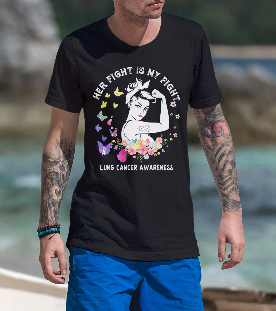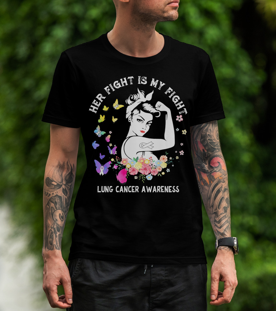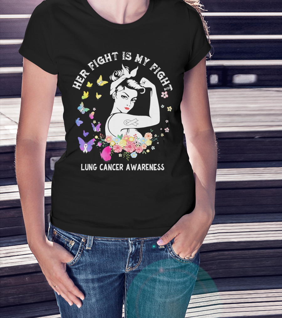 Her Fight Is My Fight Lung Cancer Awareness Rosie Style Flowers Butterflies T-Shirt