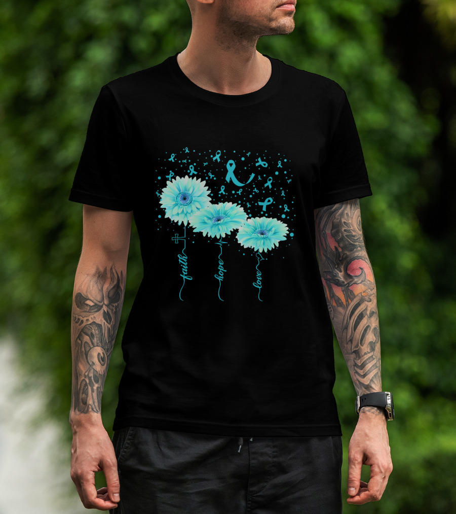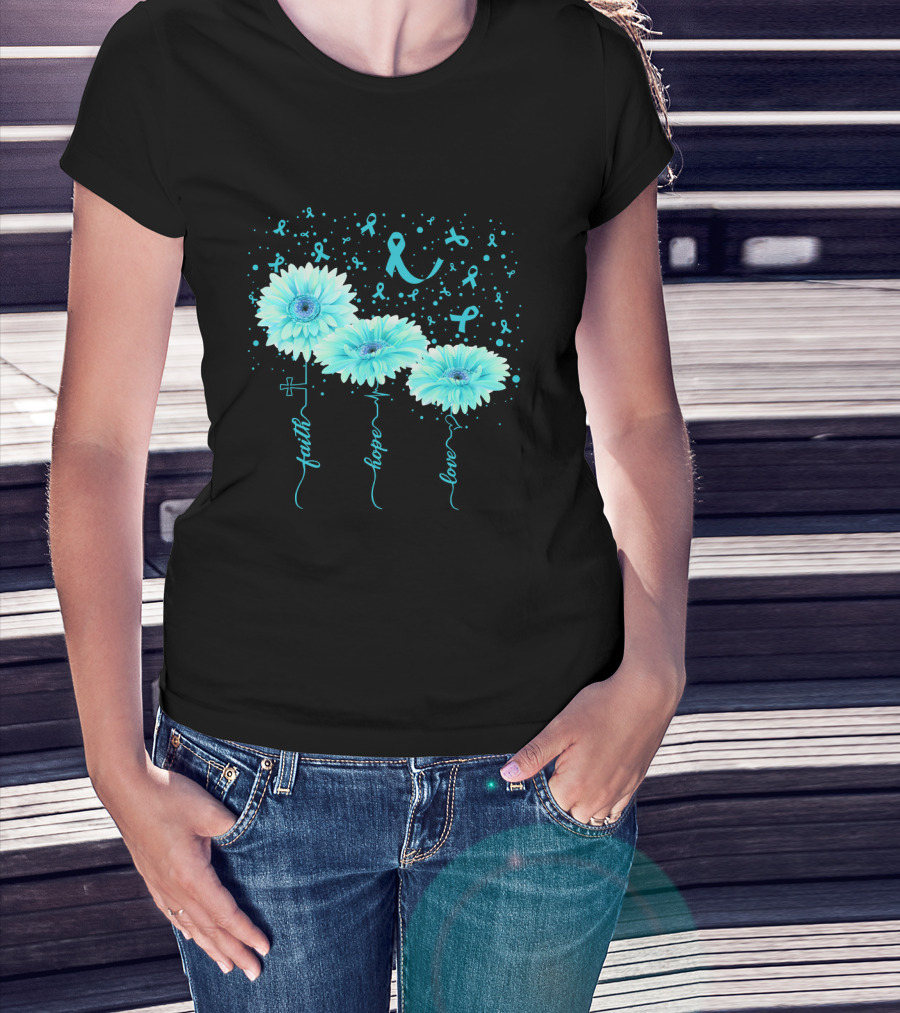 Faith Hope Love Teal Ribbon Daisy Flower Awareness T-Shirt