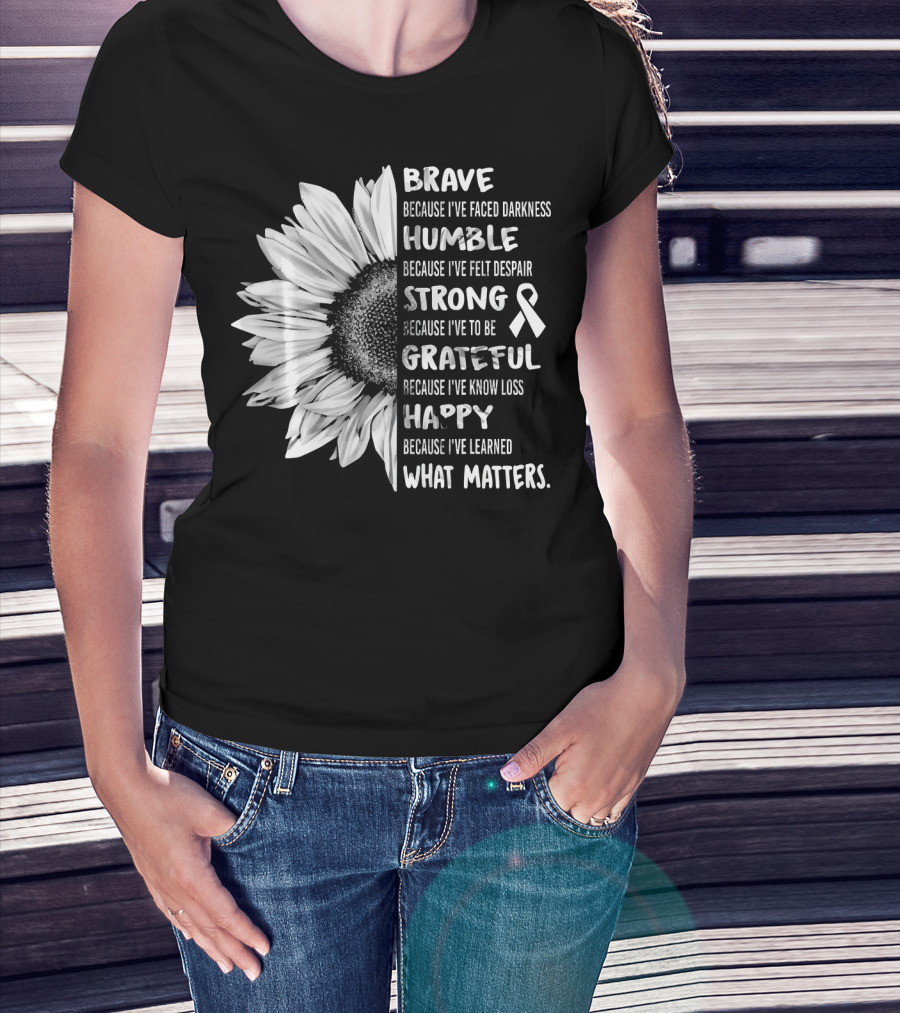 Brave Humble Strong Grateful Happy Sunflower White Ribbon Lung Cancer Awareness T-Shirt