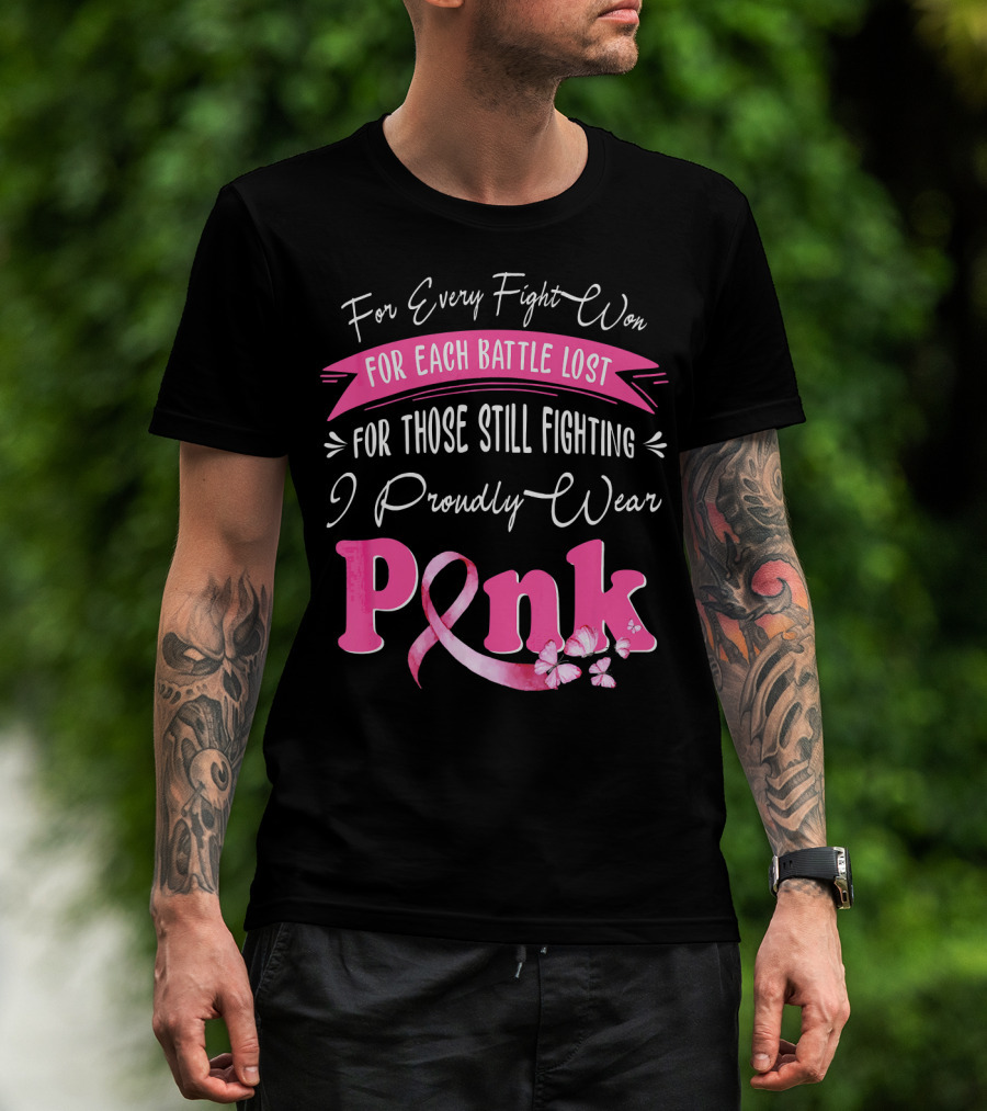 The For Every Fight Won Each Battle Lost For Those Still Fighting I Proudly Wear Pink T-shirt is designed for everyday wear and a consistent fit. Fabric is pre-shrunk ring-spun cotton with durable stitching. See the size chart below for exact measurements.